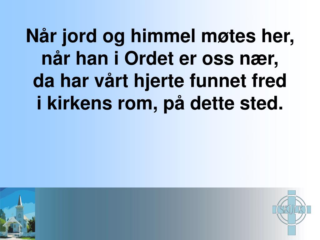 Når jord og himmel møtes her, når han i Ordet er oss nær, da har vårt hjerte funnet fred i kirkens rom, på dette sted.