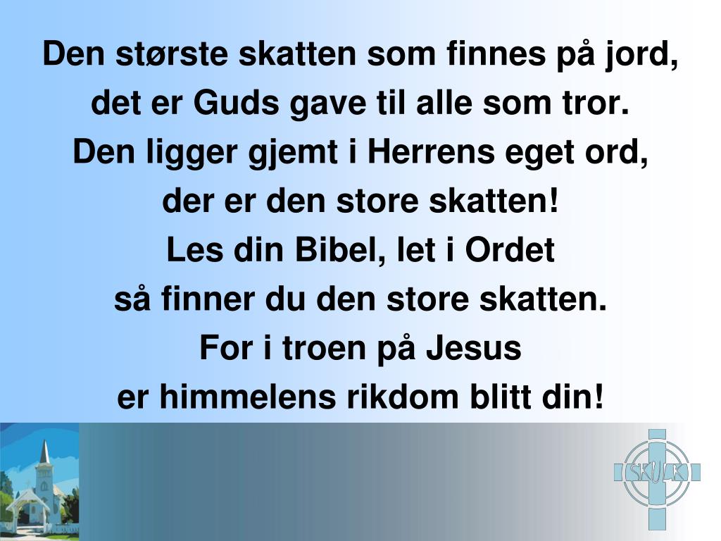 Den største skatten som finnes på jord, det er Guds gave til alle som tror. Den ligger gjemt i Herrens eget ord, der er den store skatten! Les din Bibel, let i Ordet så finner du den store skatten. For i troen på Jesus er himmelens rikdom blitt din!