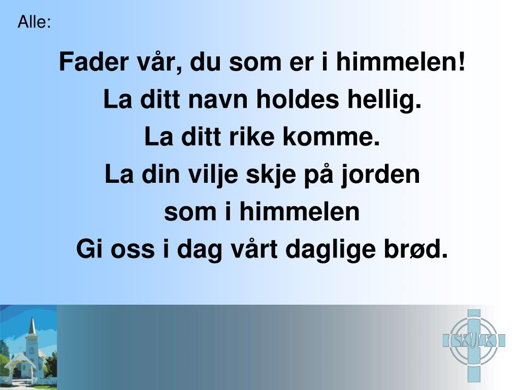 Alle: Fader vår, du som er i himmelen! La ditt navn holdes hellig. La ditt rike komme. La din vilje skje på jorden som i himmelen Gi oss i dag vårt daglige brød.