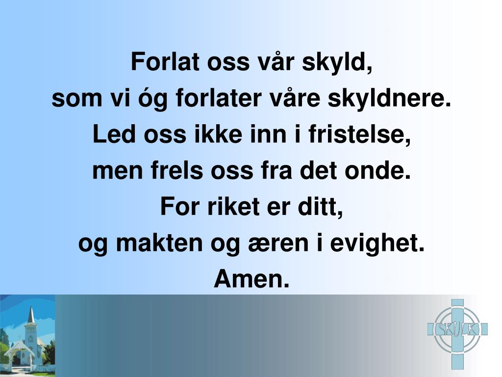 Forlat oss vår skyld, som vi óg forlater våre skyldnere. Led oss ikke inn i fristelse, men frels oss fra det onde. For riket er ditt, og makten og æren i evighet. Amen.