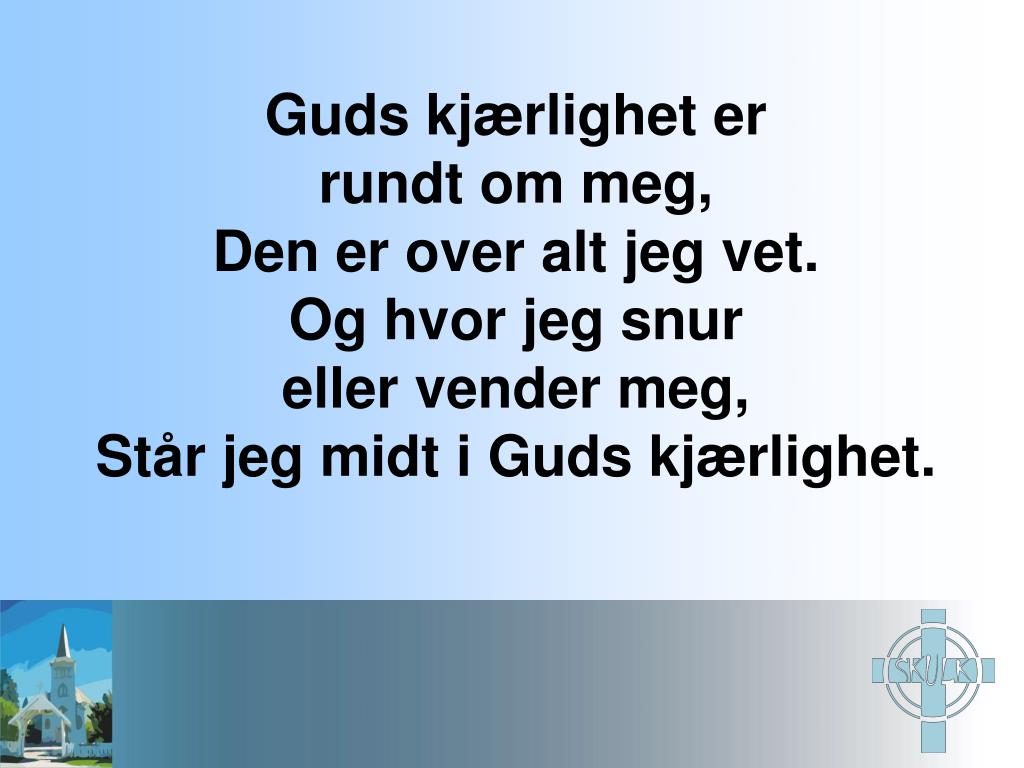 Guds kjærlighet er rundt om meg, Den er over alt jeg vet. Og hvor jeg snur eller vender meg, Står jeg midt i Guds kjærlighet.