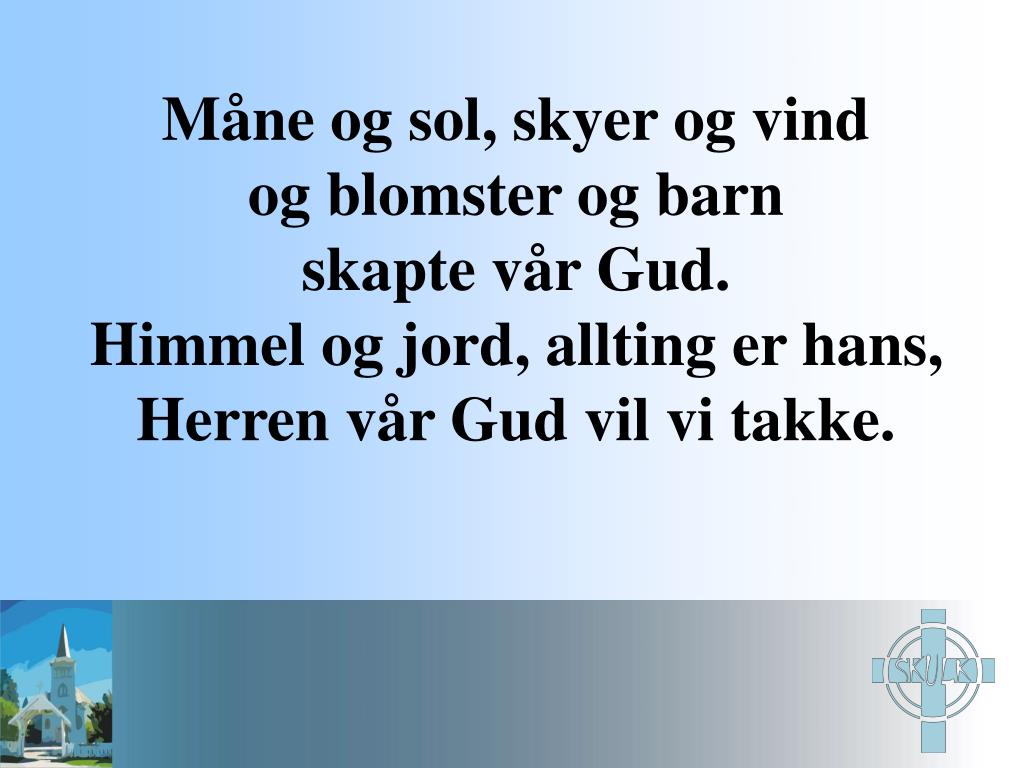 Måne og sol, skyer og vindog blomster og barn skapte vår Gud.Himmel og jord, allting er hans,Herren vår Gud vil vi takke.