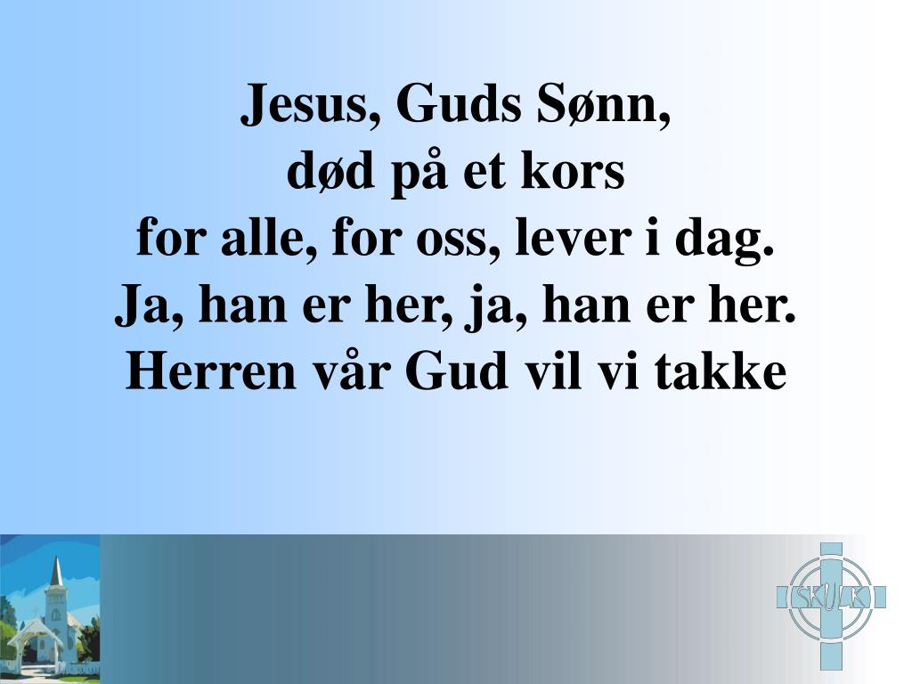 Jesus, Guds Sønn, død på et korsfor alle, for oss, lever i dag.Ja, han er her, ja, han er her.Herren vår Gud vil vi takke