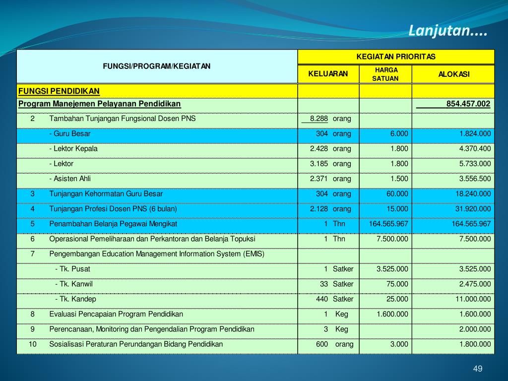 TUNJANGAN TENAGA KEPENDIDIKAN • GURU Rp. 3.071.972.640.000,- • Tunjangan Fungsional NonPNS : 501.831 guru @ Rp.3.000.000,- • Tunjangan Fungsional PNS (sesuai golongan, melekat pada gaji) • Tunjangan Profesi NonPNS : 36.579 guru @ Rp. 24.000.000,- (PNS melekat pada gaji) • Percepatan Sertifikasi 90.000 guru @ Rp. 2.000.000 • Tunjangan Khusus : 2.500 guru @ Rp. 16.200.000,- • Tunjangan Purnabhakti : 8.005 guru @ Rp. 1.500.000,- • DOSEN Rp. 59.170.000.000,- • Tunjangan Profesi NonPNS : 400 dosen @ Rp. 12.000.000,- • Tunjangan Profesi PNS : 2.128 dosen @ Rp. 15.000.000,- • Percepatan Sertifikasi 2.000 dosen @ Rp. 2.000.000 • Tunjangan Kehormatan Guru Besar : 304 dosen @ Rp. 60.000.000,- • Tunjangan Purnabhakti : 140 dosen @ Rp. 1.500.000,- • Jumlah Rp. 3.131.142.640.000,-