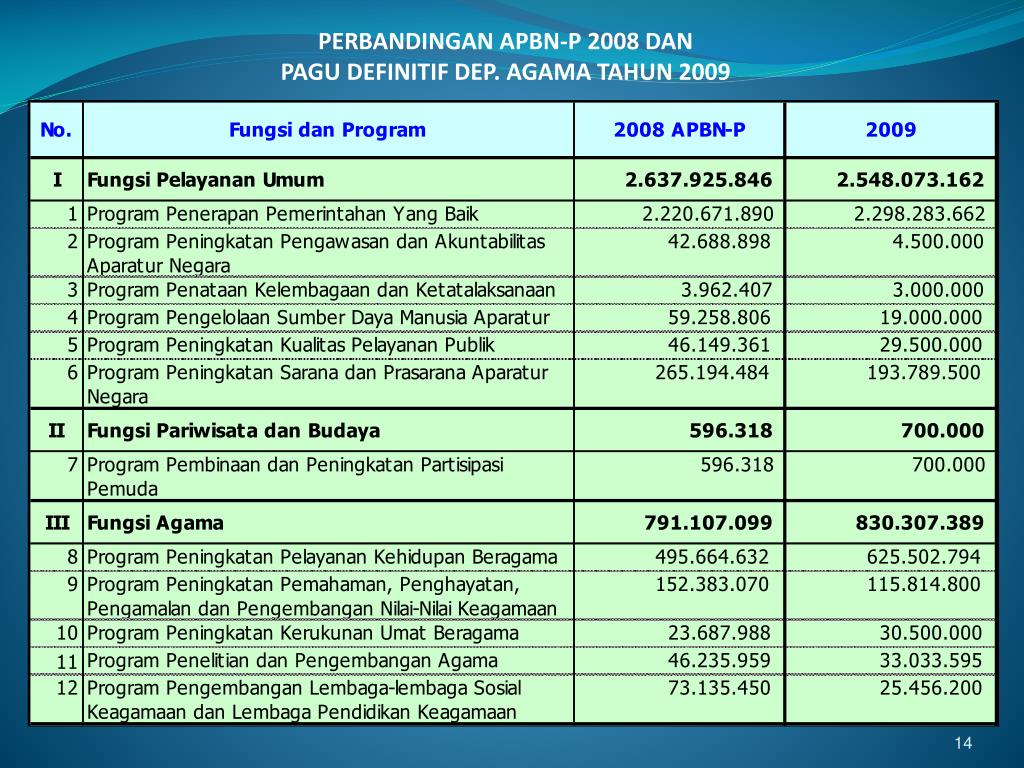 ANGGARAN DEP. AGAMATAHUN 2009 Usulan AnggaranDep. Agama tahun 2009 sebesar Rp. 30.403.987.788.000 melalui surat Menteri Agama Nomor:MA/28/2008 tanggal 25 Februari 2007 PAGU SEMENTARA RP. 20.723.203.542.000 Sesuai SE Menkeu No. SE-852/MK.02/2008 tgl 10 Juli 2008 PENGURANGAN PAGU SEMENTARA RP. 651.602.983.000 Sesuai SE Menkeu No. SE-1615/MK.02/2008 tgl 31/10/2008 ANGGARAN TAMBAHAN FUNGSI PENDIDIKAN RP. 6.585.000.000.000 Dalam rangka pemenuhan 20% Anggaran Pendidikan pada APBN 2009 PAGU DEFINITIF DEP. AGAMA TAHUN 2009 RP. 26.656.600.559.000 Berdasarkan SE Menkeu No. SE-1615/MK-02/2008 tanggal 31 Oktober 2008