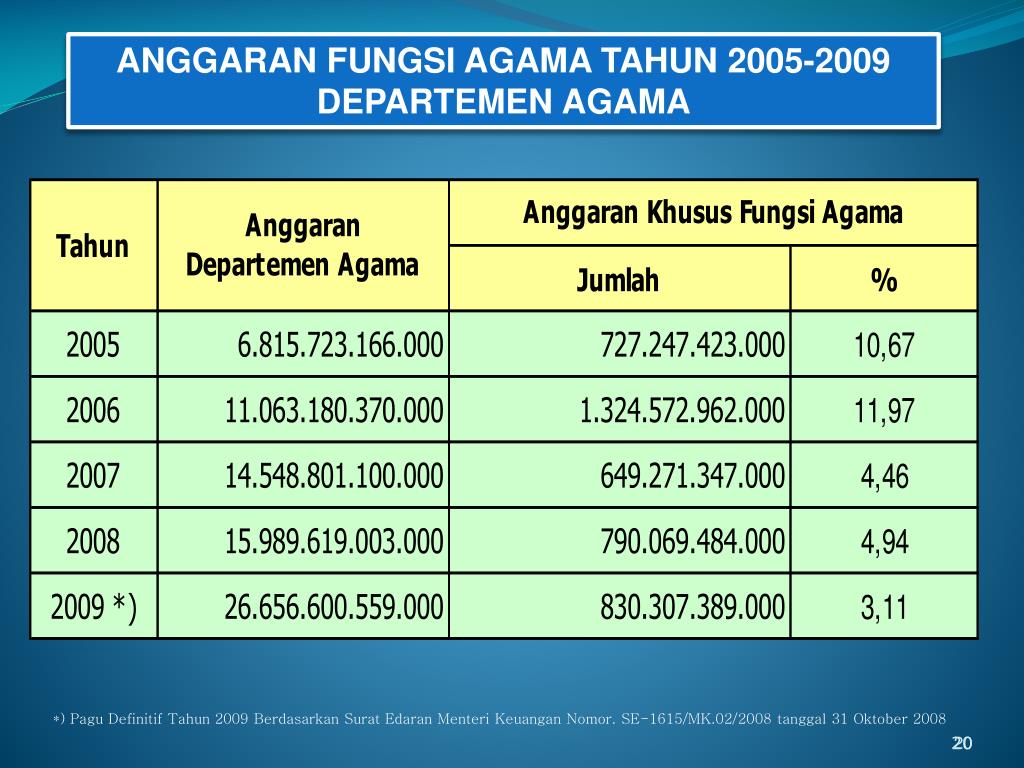 ANGGARAN FUNGSI AGAMA TAHUN 2005-2009DEPARTEMEN AGAMA *) Pagu Definitif Tahun 2009 Berdasarkan Surat Edaran Menteri Keuangan Nomor. SE-1615/MK.02/2008 tanggal 31 Oktober 2008 20