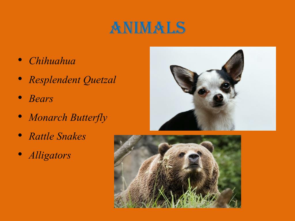 Animals • Chihuahua • Resplendent Quetzal • Bears • Monarch Butterfly • Rattle Snakes • Alligators