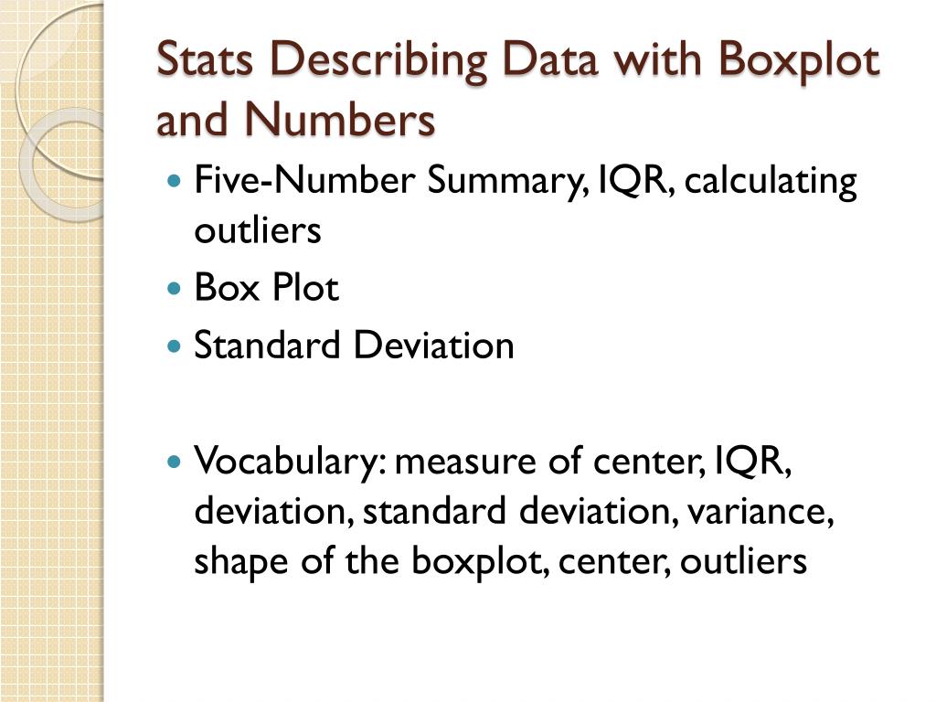 Stats Describing Data with Boxplot and Numbers • Five-Number Summary, IQR, calculating outliers • Box Plot • Standard Deviation • Vocabulary: measure of center, IQR, deviation, standard deviation, variance, shape of the boxplot, center, outliers