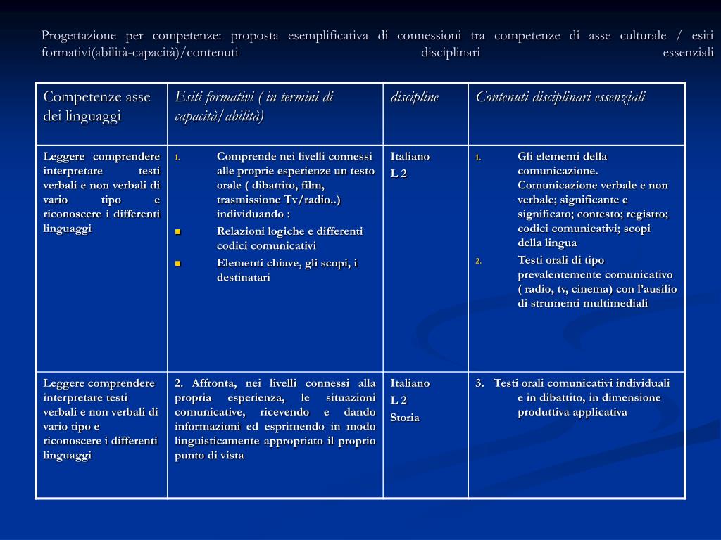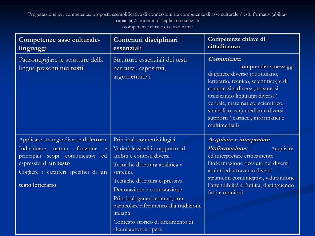 Progettazione per competenze: proposta esemplificativa di connessioni tra competenze di asse culturale / esiti formativi(abilità-capacità)/contenuti disciplinari essenziali/competenze chiave di cittadinanza