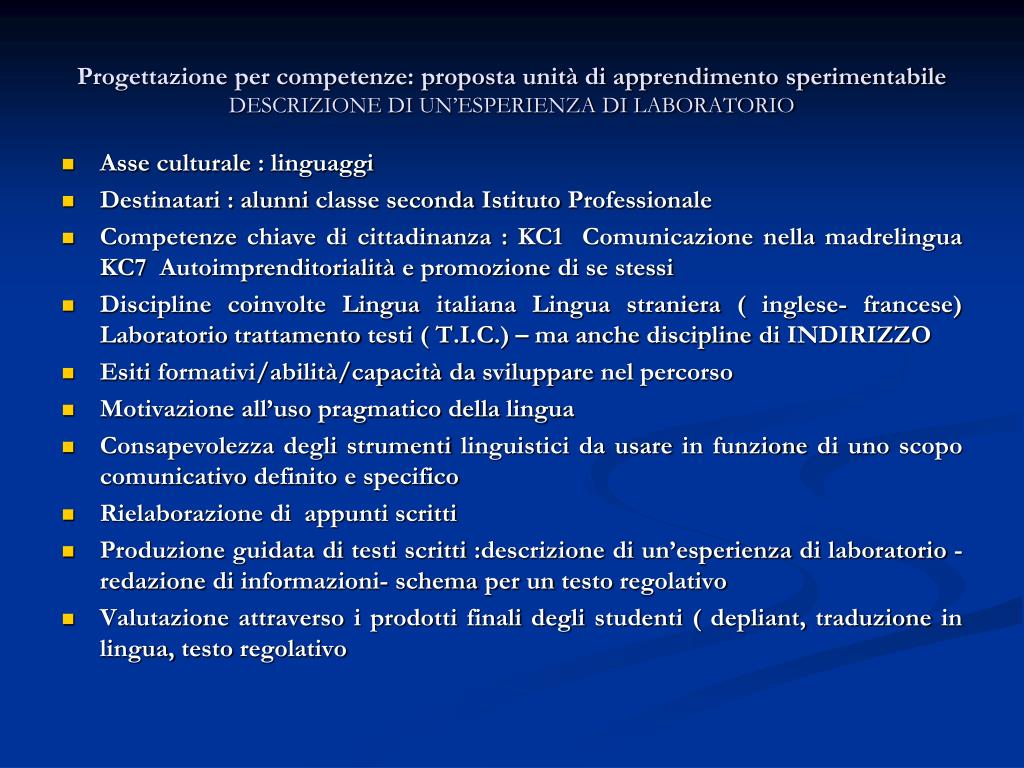 Progettazione per competenze: proposta unità di apprendimento sperimentabileDESCRIZIONE DI UN’ESPERIENZA DI LABORATORIO • Asse culturale : linguaggi • Destinatari : alunni classe seconda Istituto Professionale • Competenze chiave di cittadinanza : KC1 Comunicazione nella madrelingua KC7 Autoimprenditorialità e promozione di se stessi • Discipline coinvolte Lingua italiana Lingua straniera ( inglese- francese) Laboratorio trattamento testi ( T.I.C.) – ma anche discipline di INDIRIZZO • Esiti formativi/abilità/capacità da sviluppare nel percorso • Motivazione all’uso pragmatico della lingua • Consapevolezza degli strumenti linguistici da usare in funzione di uno scopo comunicativo definito e specifico • Rielaborazione di appunti scritti • Produzione guidata di testi scritti :descrizione di un’esperienza di laboratorio - redazione di informazioni- schema per un testo regolativo • Valutazione attraverso i prodotti finali degli studenti ( depliant, traduzione in lingua, testo regolativo