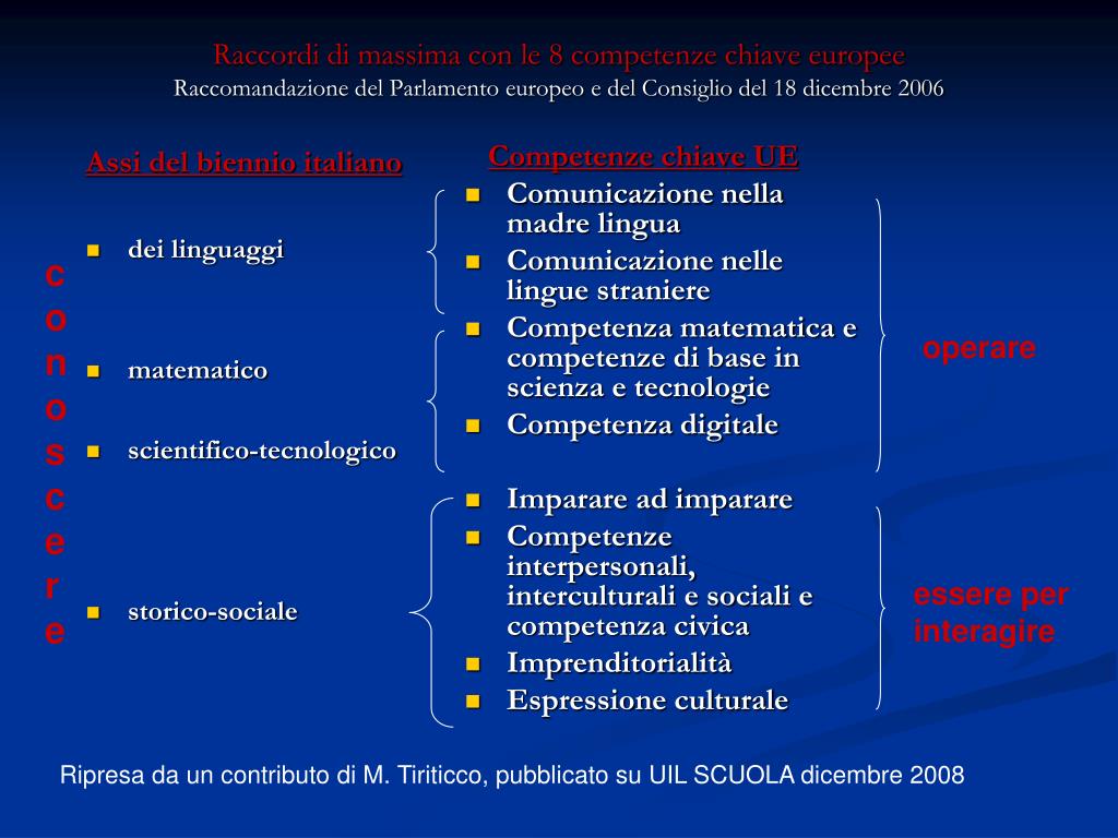 Assi del biennio italiano dei linguaggi matematico scientifico-tecnologico storico-sociale Competenze chiave UE Comunicazione nella madre lingua Comunicazione nelle lingue straniere Competenza matematica e competenze di base in scienza e tecnologie Competenza digitale Imparare ad imparare Competenze interpersonali, interculturali e sociali e competenza civica Imprenditorialità Espressione culturale Raccordi di massima con le 8 competenze chiave europeeRaccomandazione del Parlamento europeo e del Consiglio del 18 dicembre 2006 conoscere operare essere per interagire Ripresa da un contributo di M. Tiriticco, pubblicato su UIL SCUOLA dicembre 2008