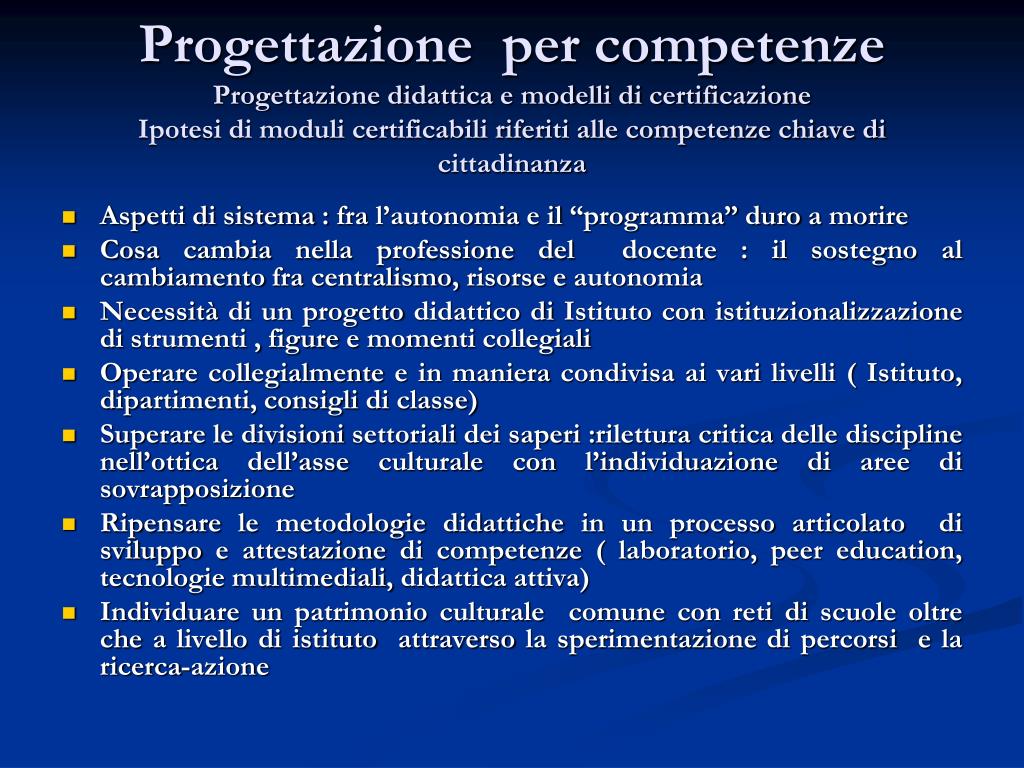 Progettazione per competenze Progettazione didattica e modelli di certificazioneIpotesi di moduli certificabili riferiti alle competenze chiave di cittadinanza • Aspetti di sistema : fra l’autonomia e il “programma” duro a morire • Cosa cambia nella professione del docente : il sostegno al cambiamento fra centralismo, risorse e autonomia • Necessità di un progetto didattico di Istituto con istituzionalizzazione di strumenti , figure e momenti collegiali • Operare collegialmente e in maniera condivisa ai vari livelli ( Istituto, dipartimenti, consigli di classe) • Superare le divisioni settoriali dei saperi :rilettura critica delle discipline nell’ottica dell’asse culturale con l’individuazione di aree di sovrapposizione • Ripensare le metodologie didattiche in un processo articolato di sviluppo e attestazione di competenze ( laboratorio, peer education, tecnologie multimediali, didattica attiva) • Individuare un patrimonio culturale comune con reti di scuole oltre che a livello di istituto attraverso la sperimentazione di percorsi e la ricerca-azione