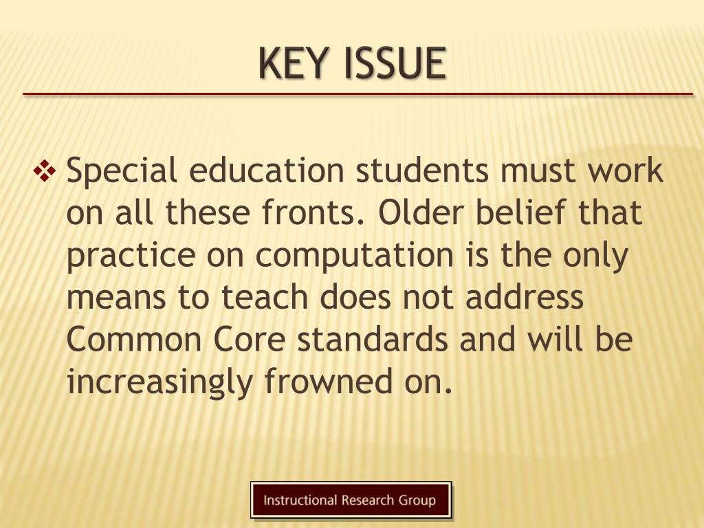 Key Issue • Special education students must work on all these fronts. Older belief that practice on computation is the only means to teach does not address Common Core standards and will be increasingly frowned on.