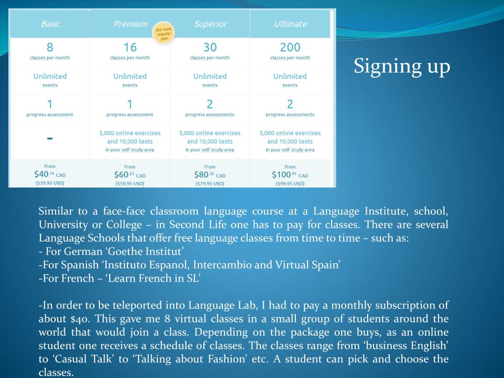 Signing up • Similar to a face-face classroom language course at a Language Institute, school, University or College – in Second Life one has to pay for classes. There are several Language Schools that offer free language classes from time to time – such as: • - For German ‘Goethe Institut’ • For Spanish ‘InstitutoEspanol, Intercambio and Virtual Spain’ • For French – ‘Learn French in SL’ • In order to be teleported into Language Lab, I had to pay a monthly subscription of about $40. This gave me 8 virtual classes in a small group of students around the world that would join a class. Depending on the package one buys, as an online student one receives a schedule of classes. The classes range from ‘business English’ to ‘Casual Talk’ to ‘Talking about Fashion’ etc. A student can pick and choose the classes.