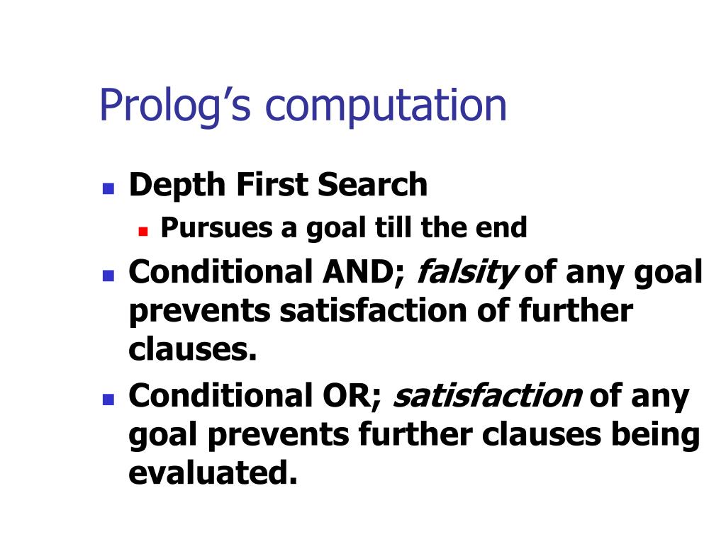 Prolog’s computation • Depth First Search • Pursues a goal till the end • Conditional AND; falsity of any goal prevents satisfaction of further clauses. • Conditional OR; satisfaction of any goal prevents further clauses being evaluated.