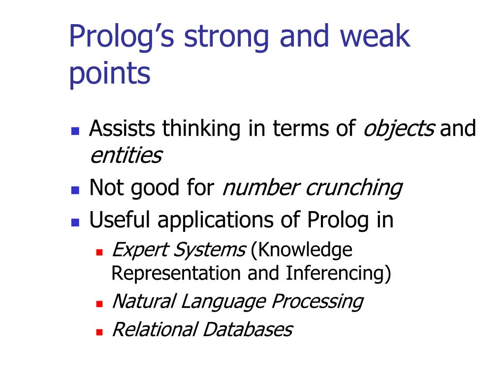 Prolog’s strong and weak points • Assists thinking in terms of objects and entities • Not good for number crunching • Useful applications of Prolog in • Expert Systems (Knowledge Representation and Inferencing) • Natural Language Processing • Relational Databases