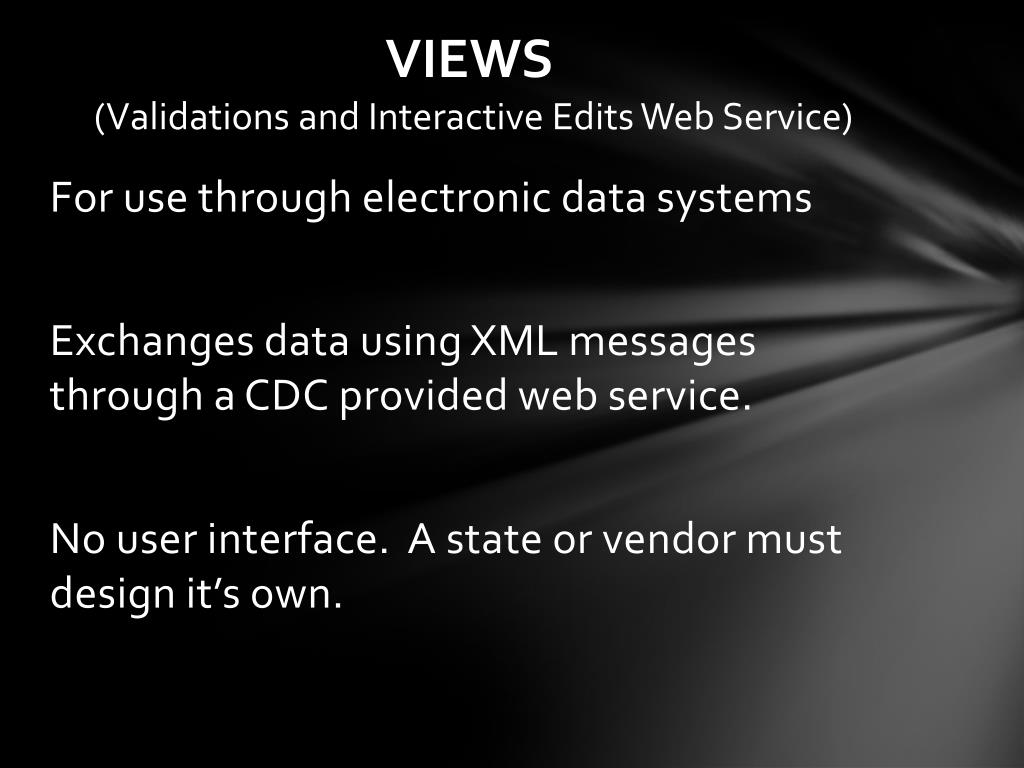 VIEWS(Validations and Interactive Edits Web Service) • For use through electronic data systems • Exchanges data using XML messages through a CDC provided web service. • No user interface. A state or vendor must design it’s own.