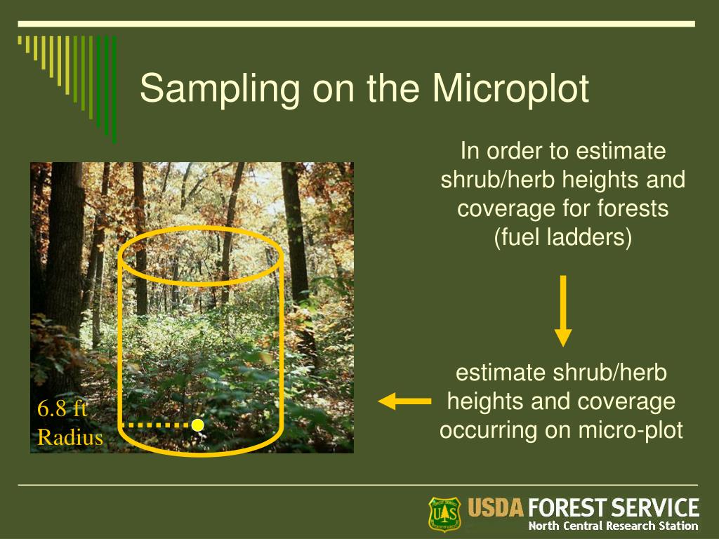 Sampling on the Microplot In order to estimate shrub/herb heights and coverage for forests (fuel ladders) estimate shrub/herb heights and coverage occurring on micro-plot 6.8 ft Radius