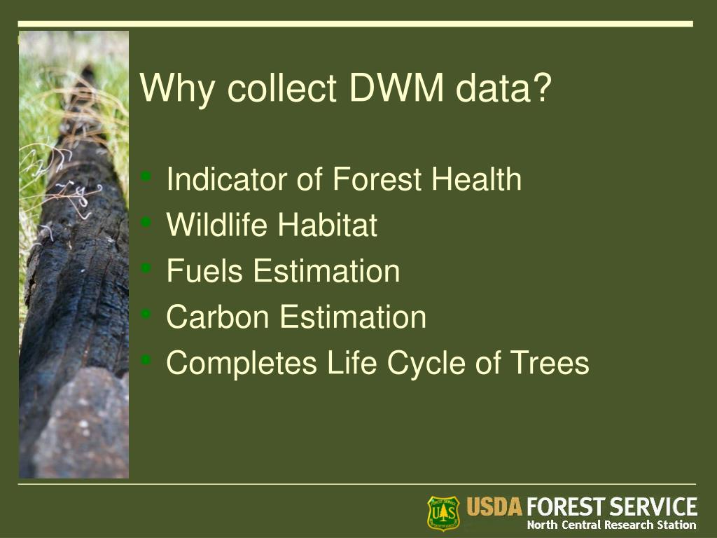 Why collect DWM data? • Indicator of Forest Health • Wildlife Habitat • Fuels Estimation • Carbon Estimation • Completes Life Cycle of Trees