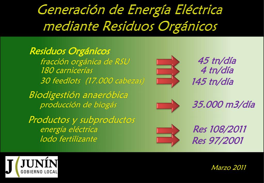 Generación de Energía Eléctrica mediante Residuos Orgánicos Residuos Orgánicos 45 tn/día fracción orgánica de RSU 4 tn/día 180 carnicerías 30 feedlots (17.000 cabezas) 145 tn/día Biodigestión anaeróbica 35.000 m3/día • producción de biogás Productos y subproductos Res 108/2011 • energía eléctrica • lodo fertilizante Res 97/2001 Marzo 2011