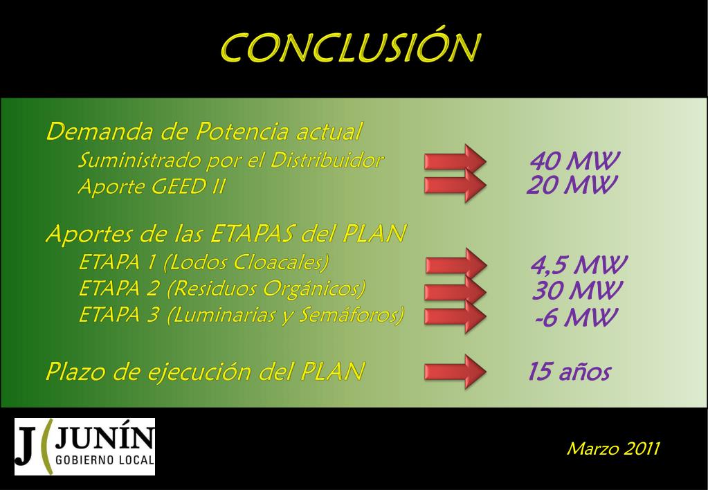 CONCLUSIÓN • Demanda de Potencia actual • Suministrado por el Distribuidor • Aporte GEED II 40 MW 20 MW • Aportes de las ETAPAS del PLAN • ETAPA 1 (Lodos Cloacales) • ETAPA 2 (Residuos Orgánicos) • ETAPA 3 (Luminarias y Semáforos) 4,5 MW 30 MW -6 MW 15 años Plazo de ejecución del PLAN Marzo 2011