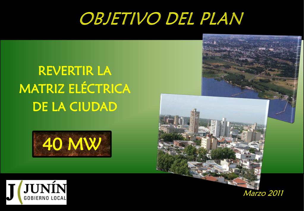 Plan Integral Energético Ciudad de Junin. Ing. Héctor Nordio Ing. Gustavo Seisdedos. Marzo 2011. OBJETIVO DEL PLAN. REVERTIR LA MATRIZ ELÉCTRICA DE LA CIUDAD. 40 MW. Marzo 2011. UBICACIÓN GEOGRÁFICA. Noroeste de la Pcia de Bs As. Marzo 2011. IMPLEMENTACIÓN DEL PLAN. ETAPA 3