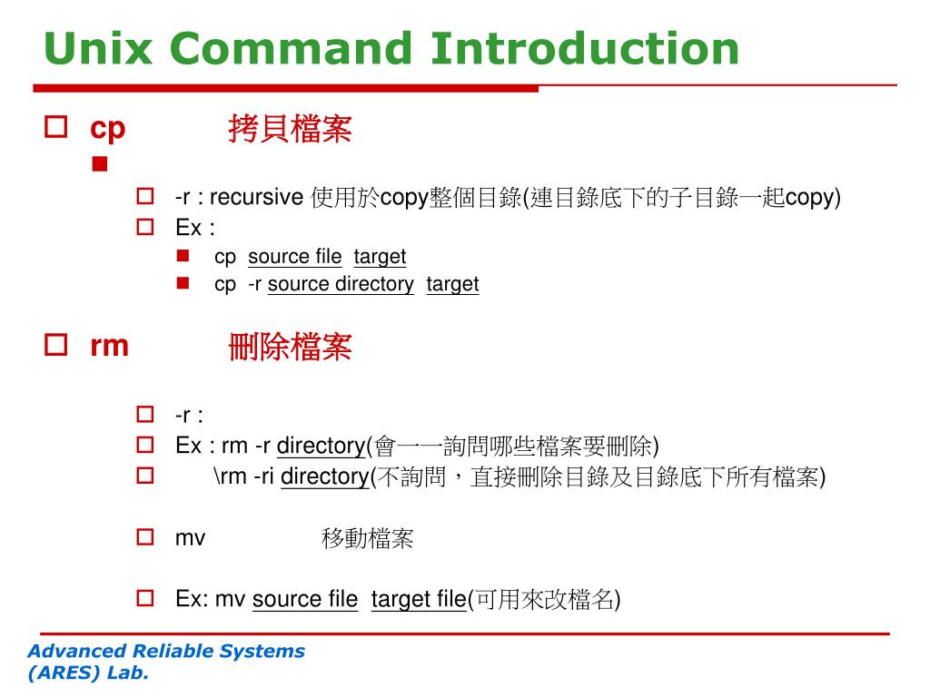 Work Station Command. Shun-Hsun Yang Advanced Reliable Systems (ARES) Laboratory Department of Electrical Engineering National Central University Jungli, Taiwan. Unix Command Introduction. cp 拷貝檔案 -r : recursive 使用於 copy 整個目錄 ( 連目錄底下的子目錄一起 copy) Ex : cp source file target