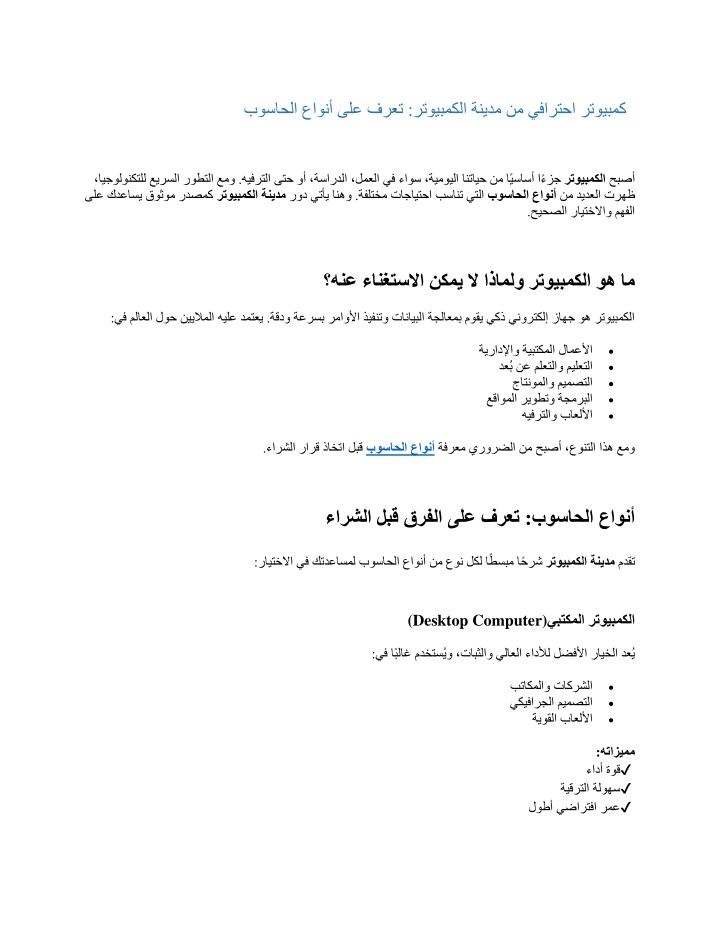 (Laptop) بوتبلالا . لقنتلا ةلوهسو ةنورملاب زيمتيو ،اًراشتنا بوساحلا عاونأ رثكأ ـل بسانم : بلاطلا نيفظوملا دعُب نع لمعلا . كتينازيم بسح بسنلأا بوتبلالا رايتخا ىلع كدعاست تاعجارم دجتس رتويبمكلا ةنيدم يف (Tablet) لا رتويبمكلا يحول . ةفيفخلا تاقيبطتلا مادختساو ،حفصتلا ،ةءارقلل يلمع رايخ هتازيمم : ✔ ✔ ✔ نزولا فيفخ ةليوط ةيراطب ةساردلاو لافطلأل بسانم (Gaming PCs) باعللأا ةزهجأ . باعللأا ىوقأ لمحتل ممصُم رتويبمكلا نم صصختم عون : كل حضوت رتويبمكلا ةنيدم ةشاش ترك لضفأ جلاعم بسنأ يفارتحا باعلأ زاهج عيمجت ةيفيك ؟رتويبمكلا ةنيدم راتخت اذامل : مدقت ثيح ،بوساحلا عاونأو رتويبمكلا لوح ةقيقد تامولعم نع ثحبي نم لكل اًمهم اًيبرع اًعجرم رتويبمكلا ةنيدم دعُت قوثوم ينقت ىوتحم