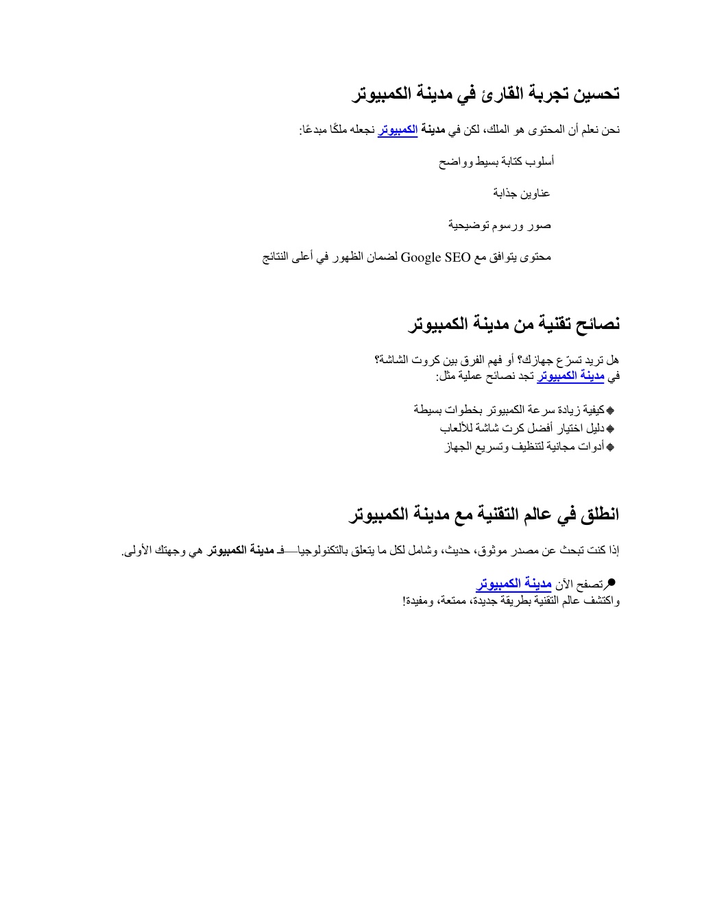 ةثيدحلا تاثيدحتلاو ةينقتلا ملاعل ةيلاثملا كتهجو :رتويبمكلا ةنيدم ةينقتلا قاشع مهي ام لك عمجت ةقوثوم ةصنم دوجو يرورضلا نم حبصأ ،عراستملا ايجولونكتلا ملاع يف بوساحلا عونا , لضفأ ذاختا يف كدعاست يتلا ةينقتلا سوردلاو ،رابخلأا ،جماربلا درجم تسيل رتويبمكلا ةنيدم . ،ةزهجلأا ملاعل ةلماشلا كتباوب يه لب ،يداع عقوم ةيجولونكتلا تارارقلا . ؟لضفلأا رتويبمكلا ةنيدم دعُت اذامل : اهنأب رتويبمكلا ةنيدم زيمتت . ةينقتلا ملاع يف يبرعلا مدختسملا ت اجايتحا ىلع لماكلا اهزيكرت . ءاوس دح ىلع نيفرتحملاو نيئدتبملا بساني قوثومو طسبم ىوتحم ميدقت ةينورتكللإا ةزهجلأاو ،تابوتبلالا ،ةيكذلا فتاوهلا ثدحلأ ةلماش ةيطغت . ءارشلا لبق كدعاست ةيقيقح براجتو ةيلمع تاعجارم . وسلا يف ةينقتلا رابخلأا رخلآ ةيموي تاثيدحت يملاعلا ق . اروف كبذجت يتلا رتويبمكلا ةنيدم ماسقأ ? ? ةزهجلأا تاعجارم ةيليصفت تاعجارم رتويبمكلا ةنيدم يف دجتس ،لامعلأل يوق بوتبلا وأ ،هتئف يف يكذ فتاه لضفأ نع ثحبت تنك ءاوس ىلع كدعاست : ةزهجلأا نيب ةنراقم ةزهجلأا تافصاومو ءادلأا ليلحت ءارشلا لبق حئاصن لوأب لاوأ ةينقتلا رابخأ رتويبمكلا ةنيدم ةسملب ىلع اذه لك .مهريغو ،يواوه ،جنوسماس ،لبأ ةكرش تاثيدحتو ،تارادصلإا ،تانلاعلإا ثدحأ عبات . ةزيمتم ةيبرع ? ? تاحورشو سورد نامأ حئاصن وأ ،رتويبمكلا ءادأ نيسحت ،ليغشت ماظن بيكرت تناك ءاوس ةينقتلا يف ةديدج ةراهم ملعت ديرت تنك اذإ — كتهجو وه مسقلا اذهف . ينورتكلإ —