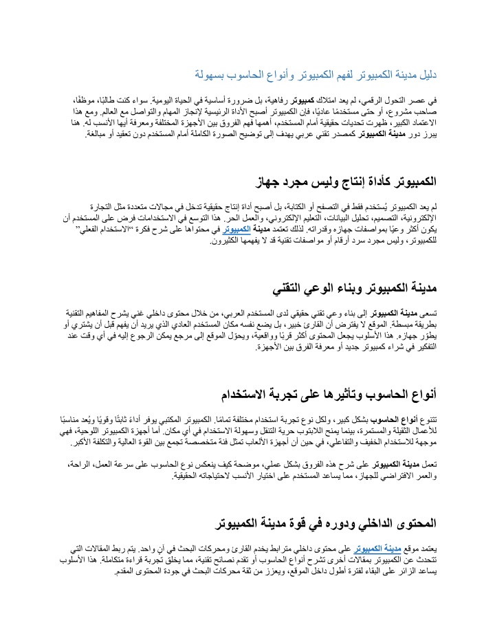 ةلوهسب بوساحلا عاونأو رتويبمكلا مهفل رتويبمكلا ةنيدم ليلد ،اًفظوم ،اًبلاط تنك ءاوس .ةيمويلا ةايحلا يف ةيساسأ ةرورض لب ،ةيهافر اذه عمو .ملاعلا عم لصاوتلاو ماهملا زاجنلإ ةيسيئرلا ةادلأا حبصأ رتويبمكلا نإف ،اًيداع اًمدختسم ىتح وأ ،عورشم بحاص لأا نيب قورفلا مهف اهمهأ ،مدختسملا مامأ ةيقيقح تايدحت ترهظ ،ريبكلا دامتعلاا انه .هل بسنلأا اهيأ ةفرعمو ةفلتخملا ةزهج ةغلابم وأ ديقعت نود مدختسملا مامأ ةلماكلا ةروصلا حيضوت ىلإ فدهي يبرع ينقت ردصمك . رتويبمك كلاتما دعي مل ،يمقرلا لوحتلا رصع يف رتويبمكلا ةنيدم رود زربي زاهج درجم سيلو جاتنإ ةادأك رتويبمكلا ةراجتلا لثم ةددعتم تلااجم يف لخدت ةيقيقح نأ مدختسملا ىلع ضرف تامادختسلاا يف عسوتلا اذه .رحلا لمعلاو ،ينورتكللإا ميلعتلا ،تانايبلا ليلحت ،ميمصتلا ،ةينورتكللإا رتويبمكلا ةركف حرش ىلع اهاوتحم يف “ يلعفلا مادختسلاا ” نوريثكلا اهمهفي لا دق ةينقت تافصاوم وأ ماقرأ درس درجم سيلو ،رتويبمكلل . جاتنإ ةادأ حبصأ لب ،ةباتكلا وأ حفصتلا يف طقف مدختسُي رتويبمكلا دعي مل ةنيدم دمتعت كلذل .هتاردقو هزاهج تافصاومب اًيعو رثكأ نوكي ينقتلا يعولا ءانبو رتويبمكلا ةنيدم ا حرشي ينغ يلخاد ىوتحم للاخ نم ،يبرعلا مدختسملا ىدل يقيقح ينقت يعو ءانب ىلإ وأ يرتشي نأ لبق مهفي نأ ديري يذلا يداعلا مدختسملا ناكم هسفن عضي لب ،ريبخ ئراقلا نأ ضرتفي لا عقوملا .ةطسبم ةقيرطب دنع تقو يأ يف هيلإ عوجرلا نكمي عجرم ىلإ عقوملا لّوحيو ،ةيعقاوو اًبرق رثكأ ىوتحملا لعجي بولسلأا اذه .هزاهج رّوطي ةينقتلا ميهافمل رتويبمكلا ةنيدم ىعست . ةزهجلأا نيب قرفلا ةفرعم وأ ديدج رتويبمك ءارش يف ريكفتلا مادختسلاا ةبرجت ىلع اهريثأتو بوساحلا عاونأ اًبسانم دعُيو اًيوقو اًتباث ًءادأ رفوي يبتكملا رتويبمكلا .اًمامت ةفلتخم مادختسا ةبرجت عون لكلو ،ريبك لكشب يهف ،ةيحوللا رتويبمكلا ةزهجأ امأ .ناكم يأ يف مادختسلاا ةلوهسو لقنتلا ةيرح بو ربكلأا ةفلكتلاو ةيلاعلا ةوقلا نيب عمجت ةصصختم ةئف لثمت باعللأا ةزهجأ نأ نيح يف ،يلعافتلاو فيفخلا مادختسلال ةهجوم . بوساحلا عاونأ عونتت تبلالا حنمي امنيب ،ةرمتسملاو ةليقثلا لامعلأل ،ةحارلا ،لمعلا ةعرس ىلع بوساحلا عون س كعني فيك ةحضوم ،يلمع لكشب قورفلا هذه حرش ىلع ةيقيقحلا هتاجايتحلا بسنلأا رايتخا ىلع مدختسملا دعاسي امم ،زاهجلل يضارتفلاا رمعلاو رتويبمكلا ةنيدم لمعت . رتويبمكلا ةنيدم ةوق يف هرودو يلخادلا ىوتحملا يتلا تلااقملا طبر متي .دحاو ٍنآ يف ثحبلا تاكرحمو ئراقلا مدخي ط بولسلأا اذه .ةلماكتم ةءارق ةبرجت قلخي امم ،ةينقت حئاصن مدقت وأ بوساحلا عاونأ حرشت ىرخأ تلااقمب رتويبمكلا نع ثدحتت وج يف ثحبلا تاكرحم ةقث نم ززعيو ،عقوملا لخاد لوطأ ةرتفل ءاقبلا ىلع رئازلا دعاسي مدقملا ىوتحملا ةد . بارتم يلخاد ىوتحم ىلع رتويبمكلا ةنيدم عقوم دمتعي