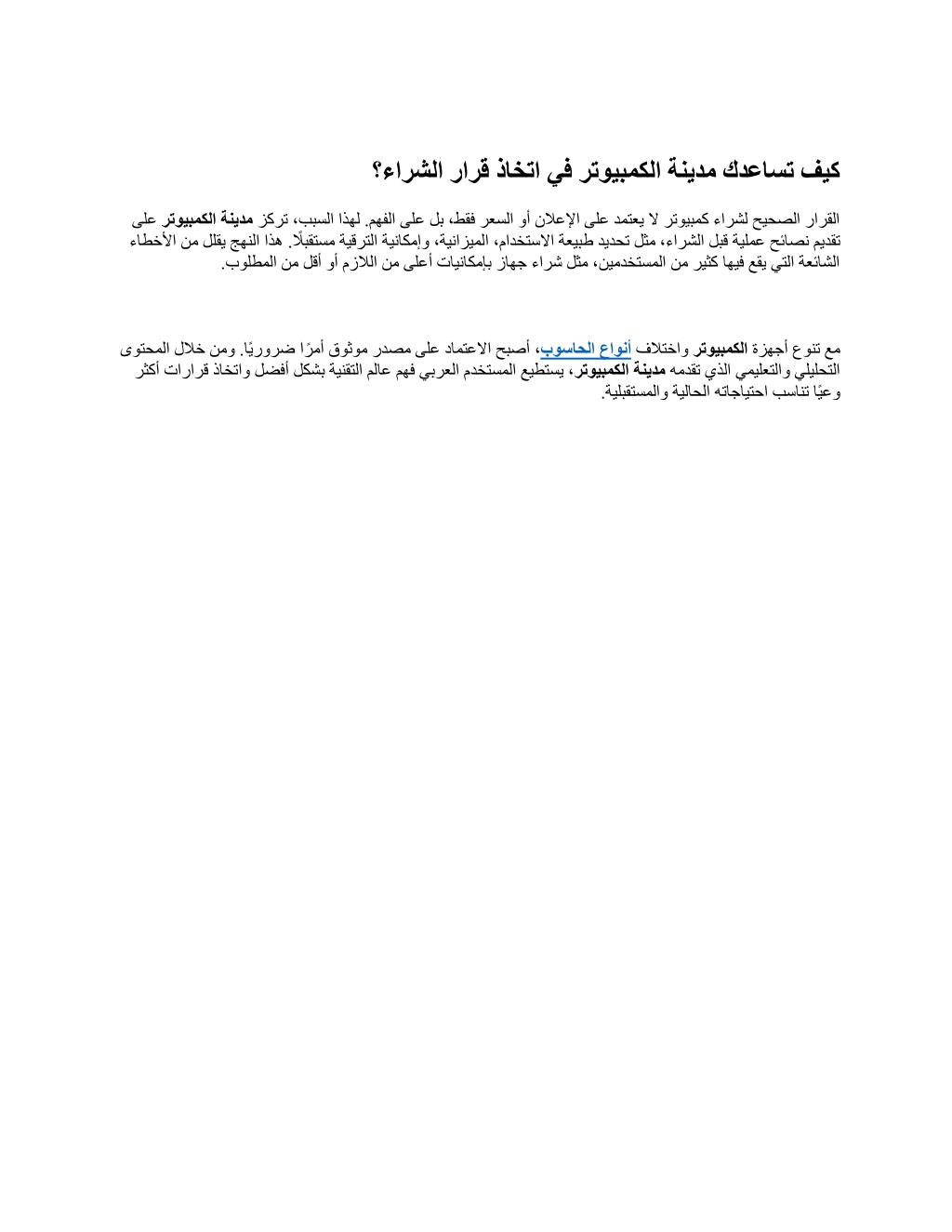 ؟ءارشلا رارق ذاختا يف رتويبمكلا ةنيدم كدعاست فيك زكرت ،ببسلا اذهل .مهفلا ىلع لب ،طقف رعسلا وأ نلاعلإا ىلع دمتعي لا رتويبمك ءارشل حيحصلا رارقلا ءاطخلأا نم للقي جهنلا اذه .ًلابقتسم ةيقرتلا ةيناكمإو ،ةينازيملا ،مادختسلاا ةعيبط ديدحت لثم ،ءارشلا لبق ةيلمع حئاصن ميدقت بولطملا نم لقأ وأ مزلالا نم ىلعأ تايناكمإب زاهج ءارش لثم ،نيمدختسملا نم ريثك اهيف عقي يتلا ةعئاشلا . ىلع رتويبمكلا ةنيدم ىوتحملا للاخ نمو .اًيرورض اًرمأ قوثوم ردصم ىلع دامتعلاا حبصأ ، ارق ذاختاو لضفأ لكشب ةينقتلا ملاع مهف يبرعلا مدختسملا عيطتسي ، رثكأ تار بوساحلا عاونأ رتويبمكلا ةنيدم . رتويبمكلا همدقت يذلا يميلعتلاو يليلحتلا ةيلبقتسملاو ةيلاحلا هتاجايتحا بسانت اًيعو ف لاتخاو ةزهجأ عونت عم