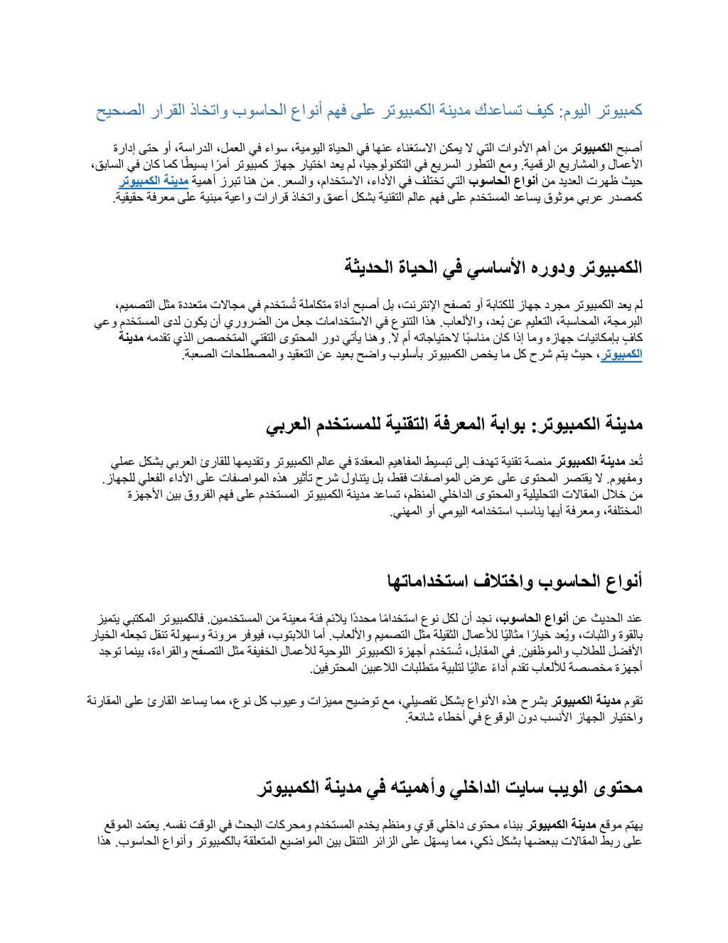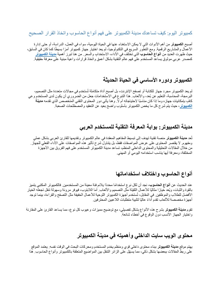 حيحصلا رارقلا ذاختاو بوساحلا عاونأ مهف ىلع رتويبمكلا ةنيدم كدعاست فيك :مويلا رتويبمك ةرادإ ىتح وأ ،ةساردلا ،لمعلا يف ءاوس ،ةيمويلا ةايحلا يف اهنع ءانغتسلاا نكمي لا يتلا تاودلأا مهأ نم ،قباسلا يف ناك امك اًطيسب اًرمأ رتويبمك زاهج رايتخا دعي مل ،ايجولونكتلا يف عيرسلا روطتلا عمو .ةيمقرلا عيراشملاو لامعلأا ةيمهأ زربت انه نم .رعسلاو ،مادختسلاا ،ءادلأا يف فلتخت ي رتويبمكلا ةنيدم ةيقيقح ةفرعم ىلع ةينبم ةيعاو تارارق ذاختاو قمعأ لكشب ةينقتلا ملاع مهف ىلع مدختسملا دعاسي قوثوم يبرع ردصمك . رتويبمكلا حبصأ تلا بوساحلا عاونأ نم ديدعلا ترهظ ثيح ةثيدحل ا ةايحلا يف يساسلأا هرودو رتويبمكلا ،ميمصتلا لثم ةددعتم تلااجم يف مدختسُت ةلماكتم ةادأ حبصأ لب ،تنرتنلإا حفصت وأ ةباتكلل زاهج درجم رتويبمكلا دعي مل يعو مدختسملا ىدل نوكي نأ يرورضلا نم لعج تامادختسلاا يف عونتلا اذه .باعللأاو ،دعُب نع ميلعتلا ،ةبساحملا ،ةجمربلا همدقت يذلا صصختملا ينقتلا ىوتحملا رود يتأي انهو .لا مأ هتاجايتحلا اًبسانم ناك اذإ ةنيدم ةبعصلا تاحلطصملاو ديقعتلا نع ديعب حضاو بولسأب رتويبمكلا صخي ام لك حرش متي ثيح ، . امو هزاهج تايناكمإب ٍفاك رتويبمكلا يبرعلا مدختسملل ةي نقتلا ةفرعملا ةباوب :رتويبمكلا ةنيدم يلمع لكشب يبرعلا ئراقلل اهميدقتو رتويبمكلا ملاع يف ةدقعملا ميهافملا طيسبت ىلإ فدهت ةينقت ةصنم .زاهجلل يلعفلا ءادلأا ىلع تافصاوملا هذه ريثأت حرش لوانتي لب ،طقف تافصاوملا ضرع ىلع ىوتحملا رصتقي لا .موهفمو ةزهجلأا نيب قورفلا مهف ىلع مدختسملا رتويبمكلا ةنيدم دعاست ،مظنملا يلخادلا ىوتحملاو ةيليلحتلا ت رتويبمكلا ةنيدم دعُت لااقملا للاخ نم . ينهملا وأ يمويلا همادختسا بساني اهيأ ةفرعمو ،ةفلتخملا اهتامادختسا فلاتخاو بوساحلا عاونأ زيمتي يبتكملا رتويبمكلاف .نيمدختسملا نم ةنيعم رايخلا هلعجت لقنت ةلوهسو ةنورم رفويف ،بوتبلالا امأ .باعللأاو ميمصتلا لثم ةليقثلا لامعلأل اًيلاثم اًرايخ دعُيو ،تابثلاو ةوقلاب فيفخلا لامعلأل ةيحوللا رتويبمكلا ةزهجأ مدختسُت ،لباقملا يف .نيفظوملاو بلاطلل لضفلأا دجوت امنيب ،ةءارقلاو حفصتلا لثم ة نيفرتحملا نيبعلالا تابلطتم ةيبلتل اًيلاع ًءادأ مدقت باعللأل ةصصخم ةزهجأ . ةئف مئلاي اًددحم اًمادختسا عون لكل نأ دجن ، بوساحلا عاونأ نع ثيدحلا دنع ةنراقملا ىلع ئراقلا دعاسي امم ،عون لك بويعو تازيمم حيضوت عم ،يليصفت لكشب عاونلأا هذه حرشب رتويبمكلا ةنيدم موقت . ةعئاش ءاط خأ يف عوقولا نود بسنلأا زاهجلا رايتخاو رتويبمكلا ةنيدم يف هتيمهأو يلخادلا تياس بيولا ىوتحم عقوملا دمتعي .هسفن تقولا يف ثحبلا تاكرحمو مدختسملا مدخي مظنمو يوق يلخاد ىوتحم ءانبب قلعتملا عيضاوملا نيب لقنتلا رئازلا ىلع لّهسي امم ،يكذ لكشب اهضعبب تلااقملا طبر ىلع اذه .بوساحلا عاونأو رتويبمكلاب ة رتويبمكلا ةنيدم عقوم متهي
