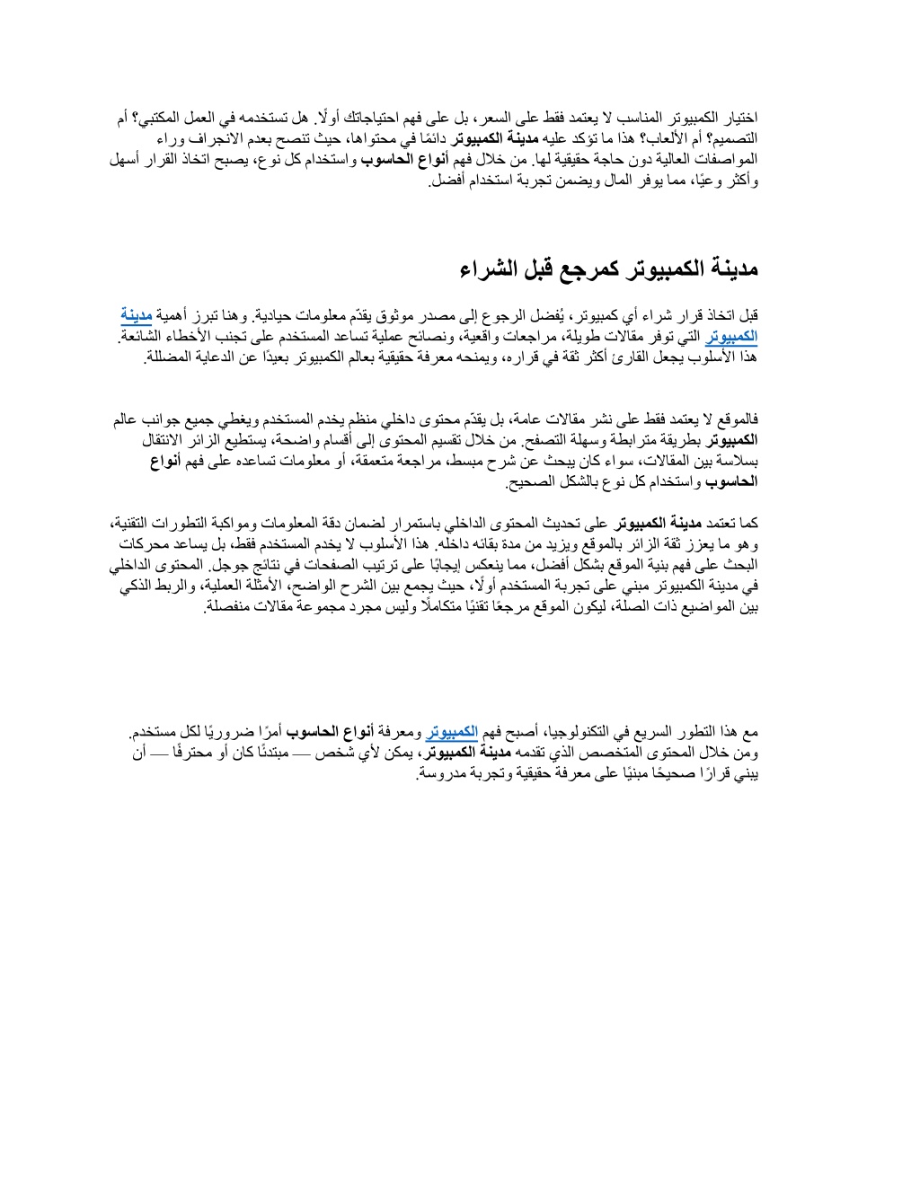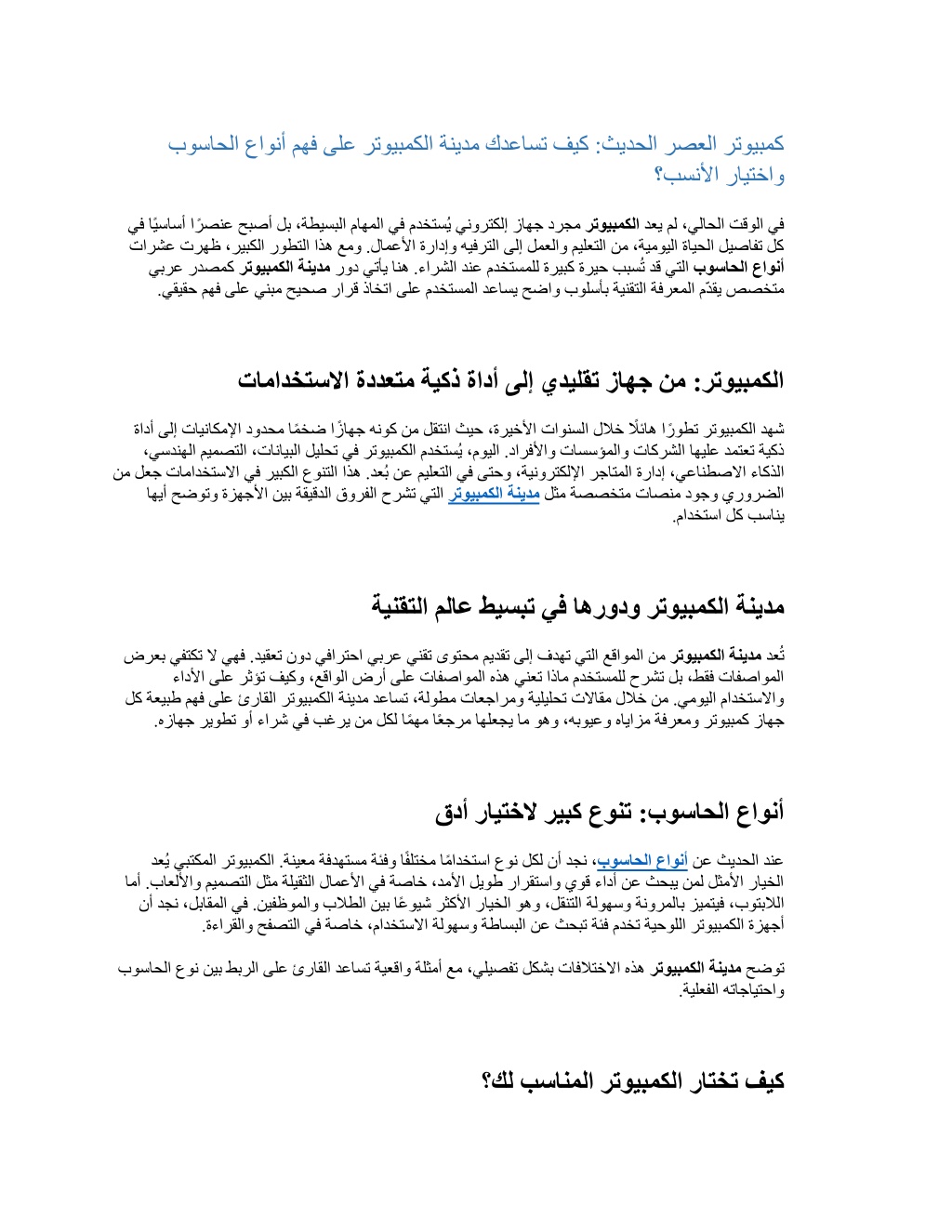 بوساحلا عاونأ مهف ىلع رتويبمكلا ةنيدم كدعاست فيك :ثيدحلا رصعلا رتويبمك ؟بسنلأا رايتخاو يف اًيساسأ اًرصنع حبصأ لب ،ةطيسبلا ماهملا يف مدختسُي ينورتكلإ زاهج درجم تارشع ترهظ ،ريبكلا روطتلا اذه عمو .لامعلأا ةرادإو هيفرتلا ىلإ لمعلاو ميلعتلا نم ،ةيمويلا ةايحلا ليصافت لك رود يتأي انه .ءارشلا دنع مدختسملل ةريبك ةريح ببسُت دق يتلا نيدم رتويبمكلا ة يبرع ردصمك يقيقح مهف ىلع ينبم حيحص رارق ذاختا ىلع مدختسملا دعاسي حضاو بولسأب ةينقتلا ةفرعملا مّدقي صصختم . رتويبمكلا دعي مل ،يلاحلا تقولا يف بوساحلا عاونأ تامادختسلاا ةددعتم ةيكذ ةادأ ىلإ يديلقت زاهج نم :رتويبمكلا ًمخض اًزاهج هنوك نم لقتنا ثيح ،ةريخلأا تاونسلا للًخ ًلًئاه اًروطت رتويبمكلا دهش ،يسدنهلا ميمصتلا ،تانايبلا ليلحت يف رتويبمكلا مدختسُي ،مويلا .دارفلأاو تاسسؤملاو تاكرشلا اهيلع دمتعت ةيكذ نم لعج تامادختسلاا يف ريبكلا عونتلا اذه .دعُب نع ميلعتلا يف ىتحو ،ةينورتكللإا رجاتملا ةرادإ ،يعانطصلاا ءاكذلا اهيأ حضوتو ةزهجلأا نيب ةقيقدلا قورفلا حرشت يتلا ةادأ ىلإ تايناكملإا دودحم ا رتويبمكلا ةنيدم لثم ةصصختم تاصنم د وجو يرورضلا مادختسا لك بساني . ةينقتلا ملاع طيسبت يف اهرودو رتويبمكلا ةنيدم ضرعب يفتكت لا يهف .ديقعت نود يفارتحا ءادلأا ىلع رثؤت فيكو ،عقاولا ضرأ ىلع تافصاوملا هذه ينعت اذام مدختسملل حرشت لب ،طقف تافصاوملا لك ةعيبط مهف ىلع ئراقلا رتويبمكلا ةنيدم دعاست ،ةلوطم تاعجارمو ةيليلحت تلااقم للًخ نم .يمويلا مادختسلااو هزاهج ريوطت وأ ءارش يف بغري نم لكل اًمهم اًعجرم اهلعجي ام وهو ،هبويعو هايا . يبرع ينقت ىوتحم ميدقت ىلإ فدهت يتلا عقاوملا نم رتويبمكلا ةنيدم دعُت زم ةفرعمو رتويبمك زاهج قدأ رايتخلا ريبك عونت :بوساحلا عاونأ دعُي يبتكملا رتويبمكلا .ةنيعم ةف امأ .باعللأاو ميمصتلا لثم ةليقثلا لامعلأا يف ةصاخ ،دملأا ليوط رارقتساو يوق ءادأ نع ثحبي نمل لثملأا رايخلا نأ دجن ،لباقملا يف .نيفظوملاو بلًطلا نيب اًعويش رثكلأا رايخلا وهو ،لقنتلا ةلوهسو ةنورملاب زيمتيف ،بوتبلًلا ةءارقلاو حفصتلا يف ةصاخ ،مادختسلاا ةلوهسو ةطاسبلا نع ثحبت ةئف مدخت ةيحوللا رتويب . دهتسم ةئفو اًفلتخم اًمادختسا عون لكل نأ دجن ، بوساحلا عاونأ نع ثيدحلا دنع مكلا ةزهجأ بوساحلا عون نيب طبرلا ىلع ئراقلا دعاست ةيعقاو ةلثمأ عم ،يليصفت لكشب تافلًتخلاا هذه رتويبمكلا ةنيدم ةيلعفلا هتاجايتحاو . حضوت ؟كل بسانملا رتويبمكلا راتخت فيك