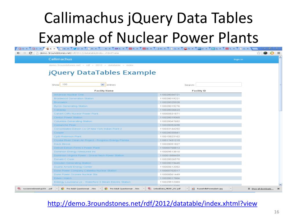 Callimachus jQuery Data Tables Example of Nuclear Power Plants http://demo.3roundstones.net/rdf/2012/datatable/index.xhtml?view