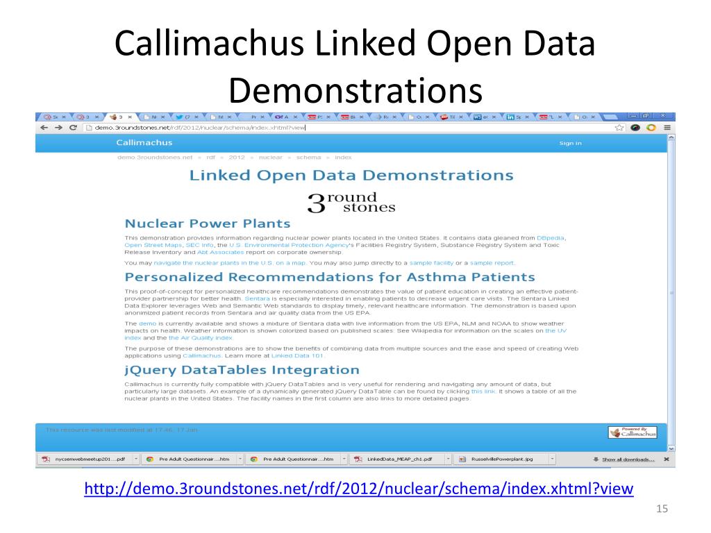 Callimachus Linked Open Data Demonstrations http://demo.3roundstones.net/rdf/2012/nuclear/schema/index.xhtml?view