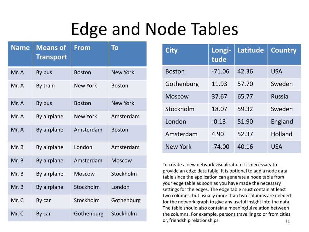 Edge and Node Tables To create a new network visualization it is necessary to provide an edge data table. It is optional to add a node data table since the application can generate a node table from your edge table as soon as you have made the necessary settings for the edges. The edge table must contain at least two columns, but usually more than two columns are needed for the network graph to give any useful insight into the data. The table should also contain a meaningful relation between the columns. For example, persons travelling to or from cities or, friendship relationships.