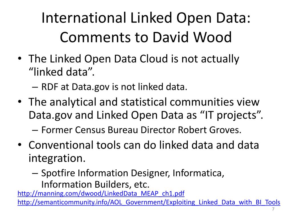 International Linked Open Data:Comments to David Wood • The Linked Open Data Cloud is not actually “linked data”. • RDF at Data.gov is not linked data. • The analytical and statistical communities view Data.gov and Linked Open Data as “IT projects”. • Former Census Bureau Director Robert Groves. • Conventional tools can do linked data and data integration. • Spotfire Information Designer, Informatica, Information Builders, etc. http://manning.com/dwood/LinkedData_MEAP_ch1.pdf http://semanticommunity.info/AOL_Government/Exploiting_Linked_Data_with_BI_Tools