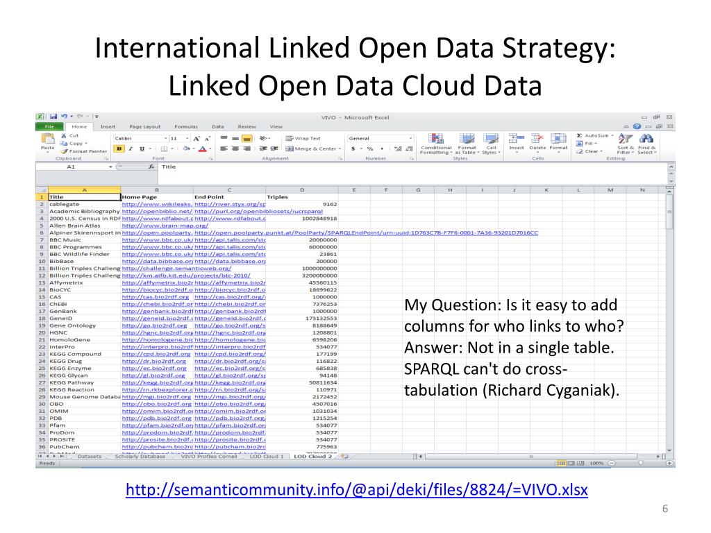 International Linked Open Data Strategy:Linked Open Data Cloud Data My Question: Is it easy to add columns for who links to who? Answer: Not in a single table. SPARQL can't do cross-tabulation (Richard Cyganiak). http://semanticommunity.info/@api/deki/files/8824/=VIVO.xlsx