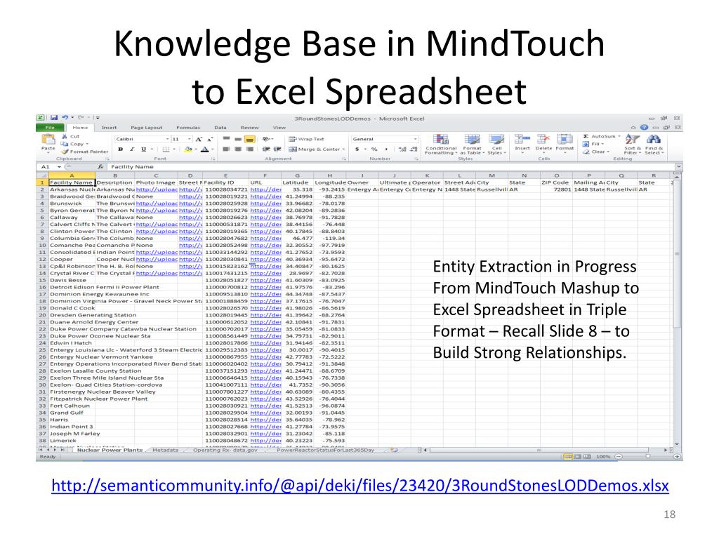 Knowledge Base in MindTouchto Excel Spreadsheet Entity Extraction in Progress From MindTouchMashup to Excel Spreadsheet in Triple Format – Recall Slide 8 – to Build Strong Relationships. http://semanticommunity.info/@api/deki/files/23420/3RoundStonesLODDemos.xlsx