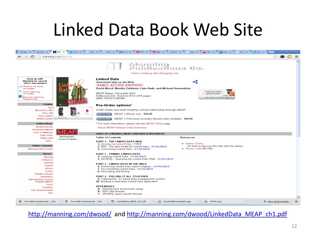 Linked Data Book Web Site http://manning.com/dwood/ and http://manning.com/dwood/LinkedData_MEAP_ch1.pdf