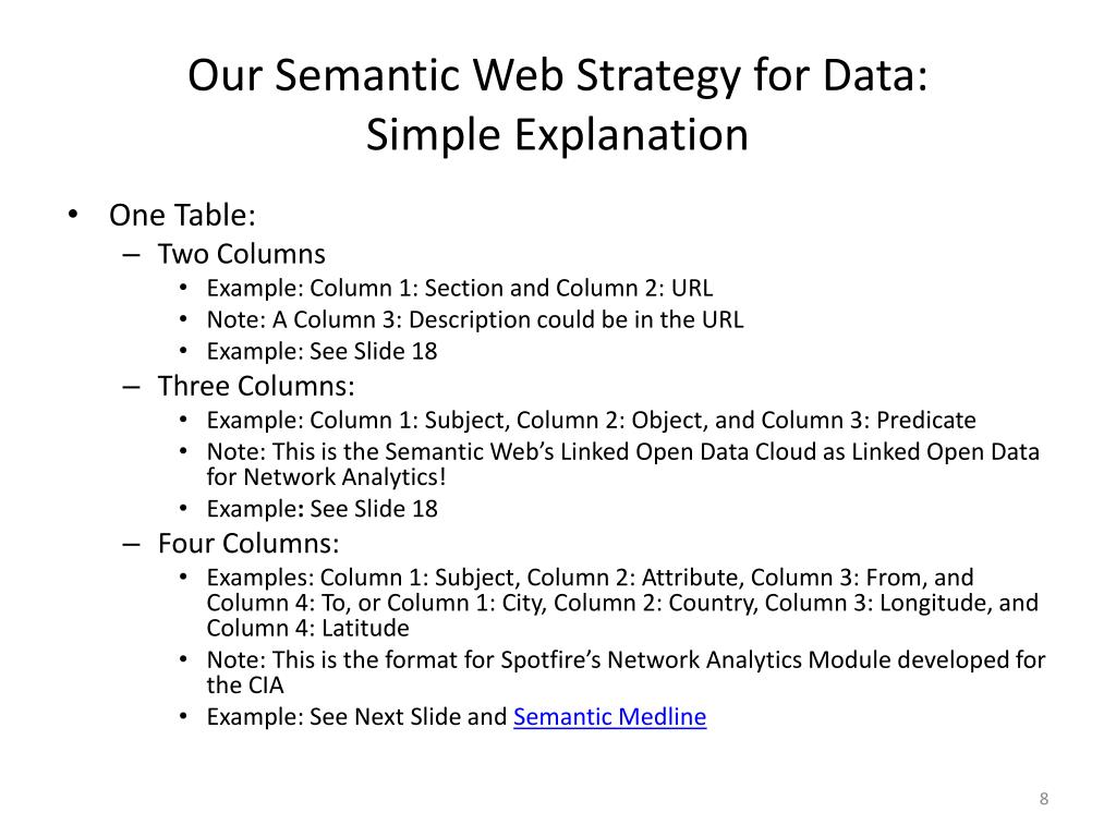 Our Semantic Web Strategy for Data:Simple Explanation • One Table: • Two Columns • Example: Column 1: Section and Column 2: URL • Note: A Column 3: Description could be in the URL • Example: See Slide 18 • Three Columns: • Example: Column 1: Subject, Column 2: Object, and Column 3: Predicate • Note: This is the Semantic Web’s Linked Open Data Cloud as Linked Open Data for Network Analytics! • Example: See Slide 18 • Four Columns: • Examples: Column 1: Subject, Column 2: Attribute, Column 3: From, and Column 4: To, or Column 1: City, Column 2: Country, Column 3: Longitude, and Column 4: Latitude • Note: This is the format for Spotfire’s Network Analytics Module developed for the CIA • Example: See Next Slide and Semantic Medline