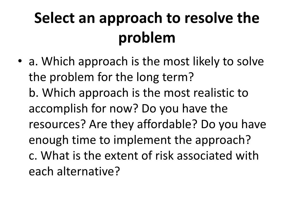 Select an approach to resolve the problem • a. Which approach is the most likely to solve the problem for the long term?b. Which approach is the most realistic to accomplish for now? Do you have the resources? Are they affordable? Do you have enough time to implement the approach?c. What is the extent of risk associated with each alternative?