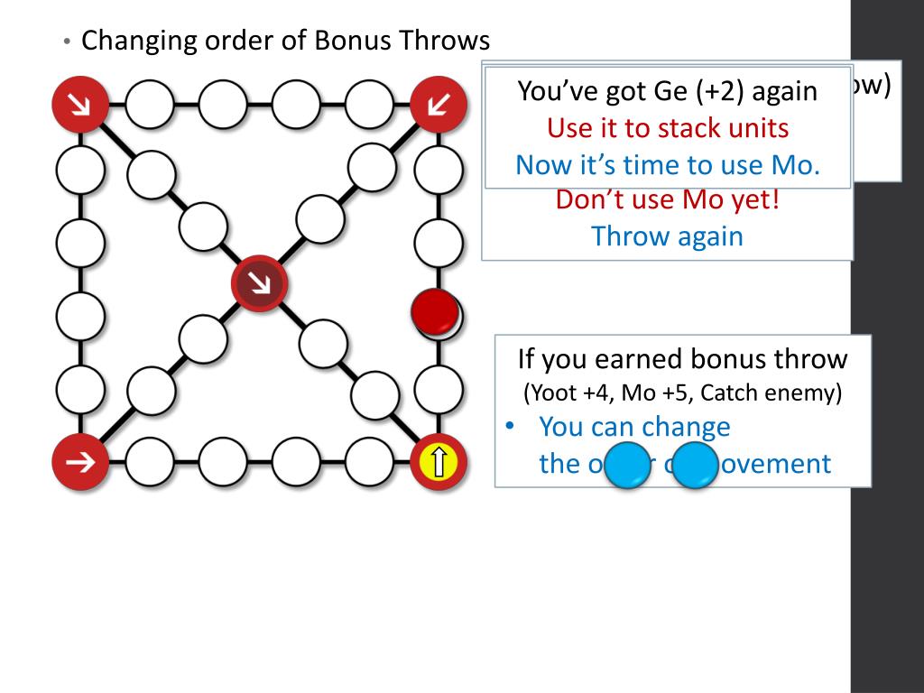 You’ve got Mo (+5 +1 throw) Don’t use it yet! Throw one more time. You’ve got Ge (+2) Use it to catch enemy You earned bonus throw. Don’t use Mo yet! Throw again You’ve got Ge (+2) again Use it to stack units Now it’s time to use Mo. • Changing order of Bonus Throws • If you earned bonus throw • (Yoot +4, Mo +5, Catch enemy) • You can changethe order of movement
