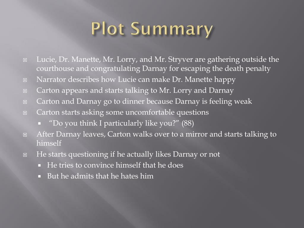 Plot Summary • Lucie, Dr. Manette, Mr. Lorry, and Mr. Stryver are gathering outside the courthouse and congratulating Darnay for escaping the death penalty • Narrator describes how Lucie can make Dr. Manette happy • Carton appears and starts talking to Mr. Lorry and Darnay • Carton and Darnay go to dinner because Darnay is feeling weak • Carton starts asking some uncomfortable questions • “Do you think I particularly like you?”(88) • After Darnay leaves, Carton walks over to a mirror and starts talking to himself • He starts questioning if he actually likes Darnay or not • He tries to convince himself that he does • But he admits that he hates him