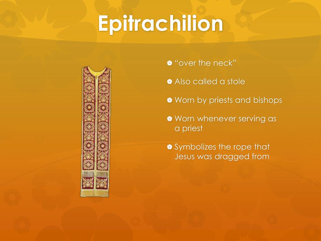 Epitrachilion • “over the neck” • Also called a stole • Worn by priests and bishops • Worn whenever serving as a priest • Symbolizes the rope that Jesus was dragged from
