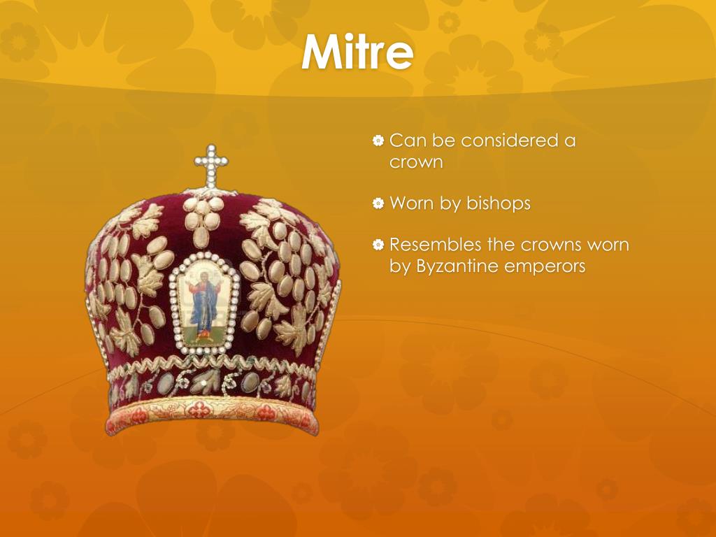 Mitre • Can be considered a crown • Worn by bishops • Resembles the crowns worn by Byzantine emperors