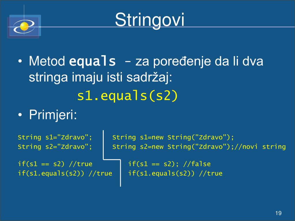 Stringovi Metod equals - za poređenje da li dva stringa imaju isti sadržaj: s1.equals(s2) Primjeri: String s1="Zdravo"; String s1=new String("Zdravo"); String s2="Zdravo"; String s2=new String("Zdravo");//novi string if(s1 == s2) //true if(s1 == s2); //false if(s1.equals(s2)) //true if(s1.equals(s2)) //true 19