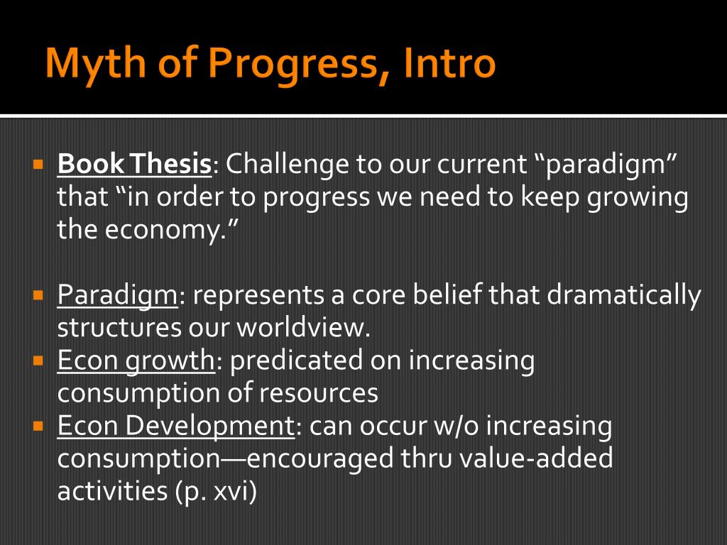 Myth of Progress, Intro • Book Thesis: Challenge to our current “paradigm” that “in order to progress we need to keep growing the economy.” • Paradigm: represents a core belief that dramatically structures our worldview. • Econ growth: predicated on increasing consumption of resources • Econ Development: can occur w/o increasing consumption—encouraged thru value-added activities (p. xvi)