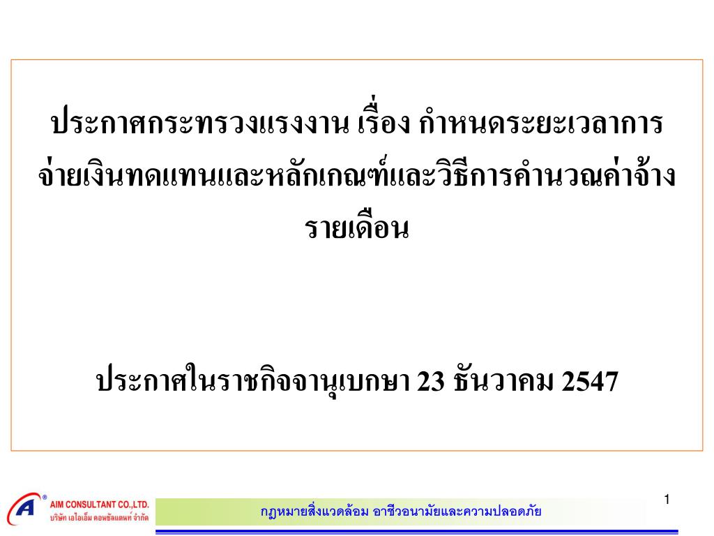 ประกาศกระทรวงแรงงาน เรื่อง กำหนดระยะเวลาการจ่ายเงินทดแทนและหลักเกณฑ์และวิธีการคำนวณค่าจ้างรายเดือน ประกาศในราชกิจจานุเบกษา 23 ธันวาคม 2547. สรุปสาระสำคัญ.