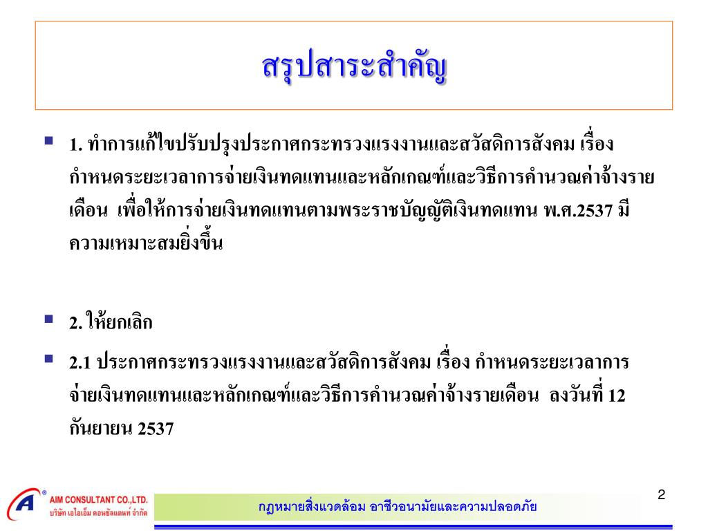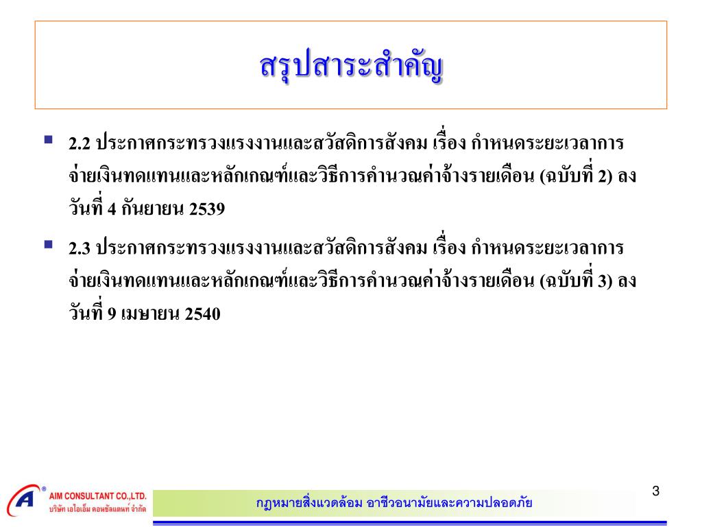 สรุปสาระสำคัญ • 2.2 ประกาศกระทรวงแรงงานและสวัสดิการสังคม เรื่อง กำหนดระยะเวลาการจ่ายเงินทดแทนและหลักเกณฑ์และวิธีการคำนวณค่าจ้างรายเดือน (ฉบับที่ 2) ลงวันที่ 4 กันยายน 2539 • 2.3 ประกาศกระทรวงแรงงานและสวัสดิการสังคม เรื่อง กำหนดระยะเวลาการจ่ายเงินทดแทนและหลักเกณฑ์และวิธีการคำนวณค่าจ้างรายเดือน (ฉบับที่ 3) ลงวันที่ 9 เมษายน 2540